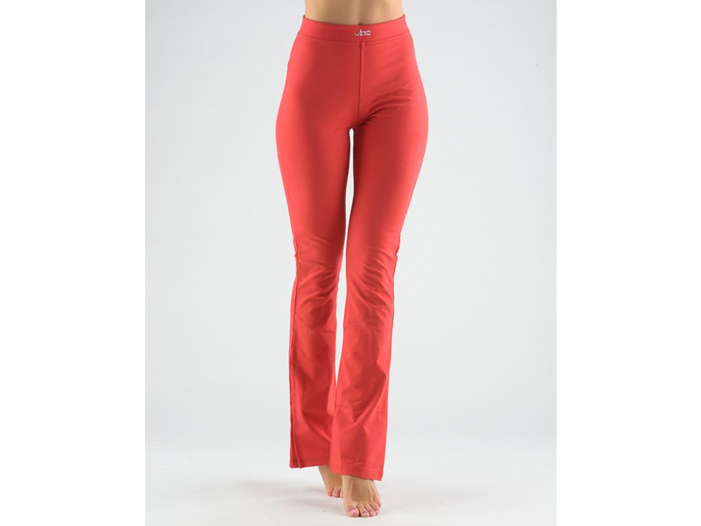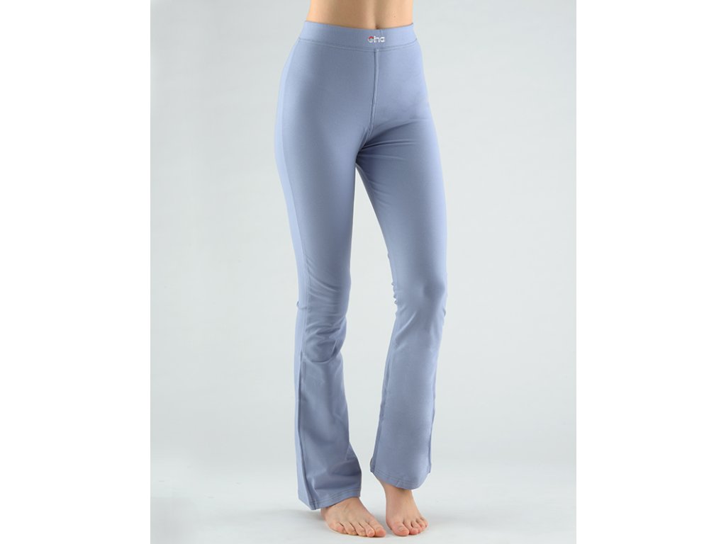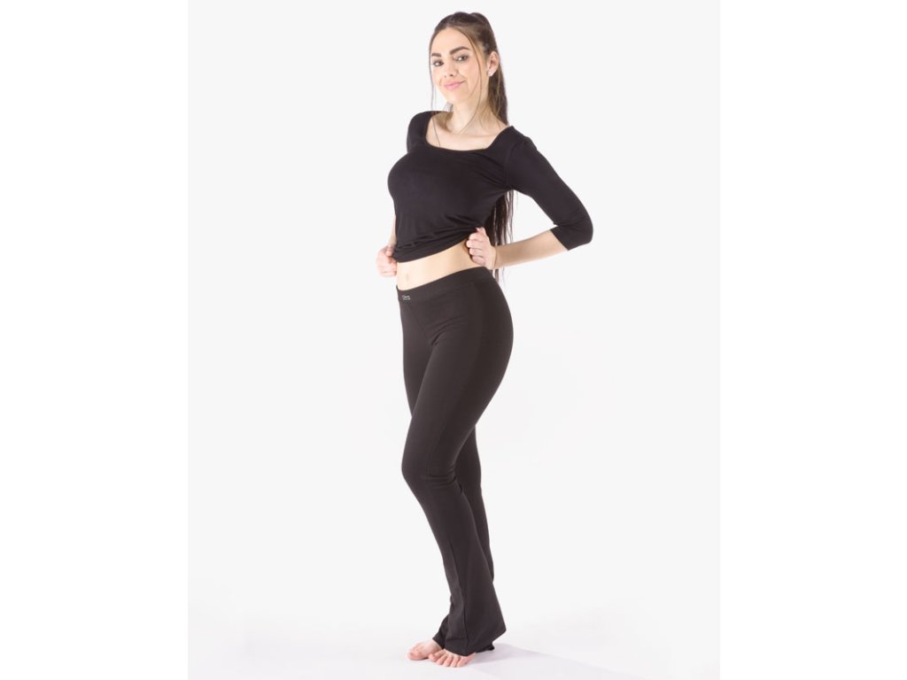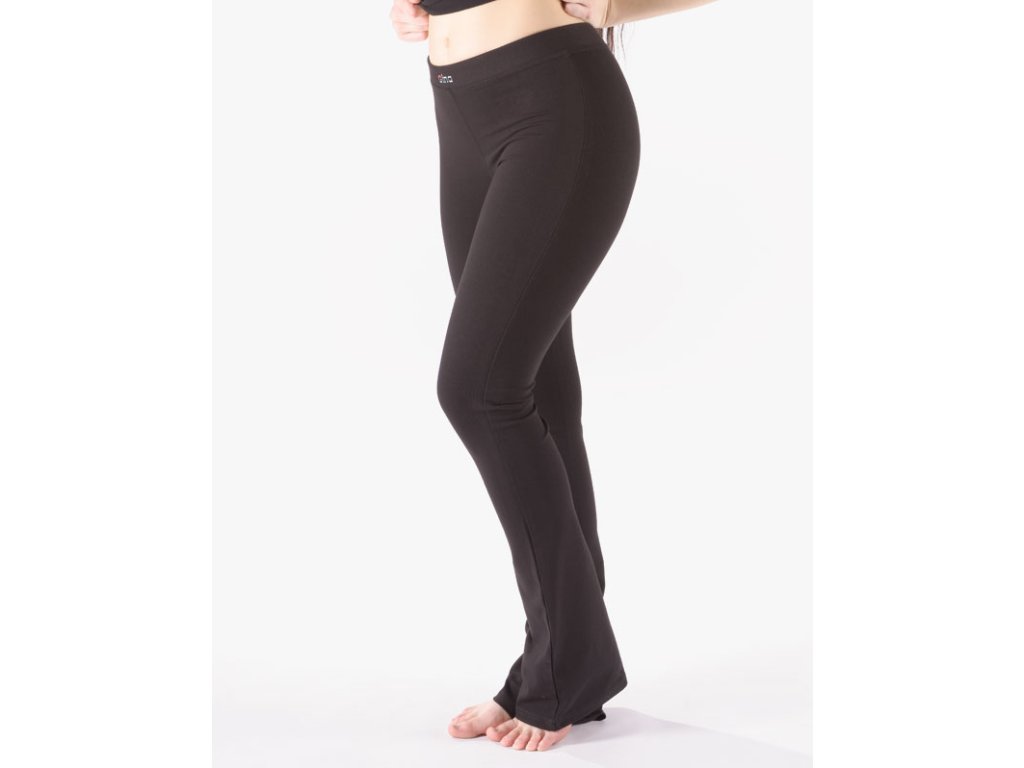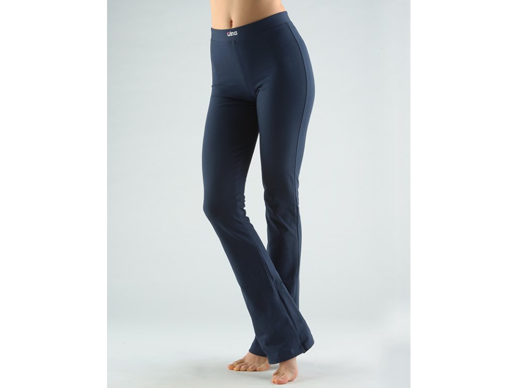 Zvonové dlouhé kalhoty v prodloužené délce, dámské šité sportovní prádlo. V pasovém kraji je zašitá širší pruženka. Legíny jsou jednobarevné. Na pasovém kraji je umístěné logo.