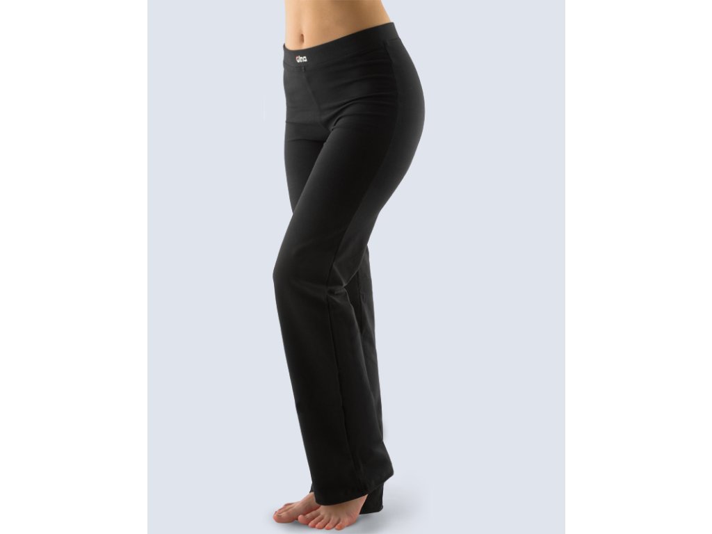Rovné dlouhé kalhoty v základní délce, dámské šité sportovní prádlo. V pasovém kraji je zašitá širší pruženka. Legíny jsou jednobarevné. Na pasovém kraji je umístěné logo.