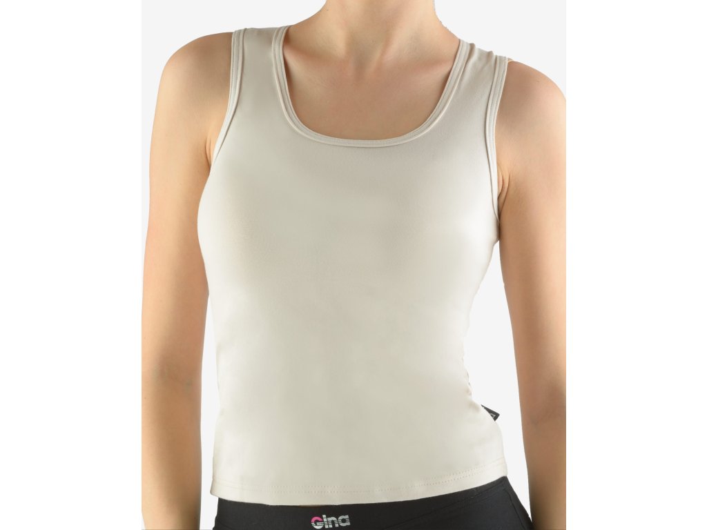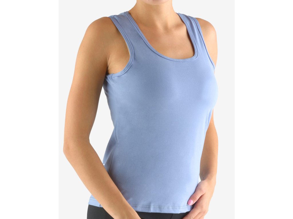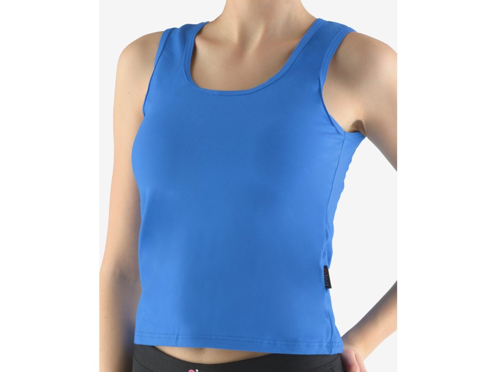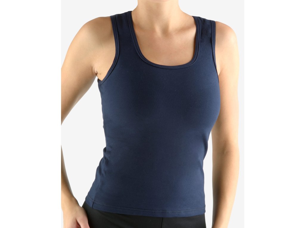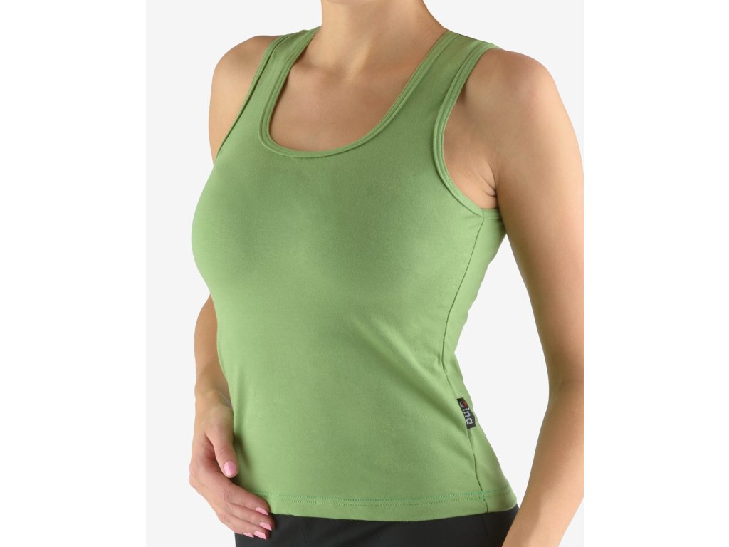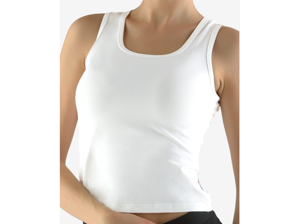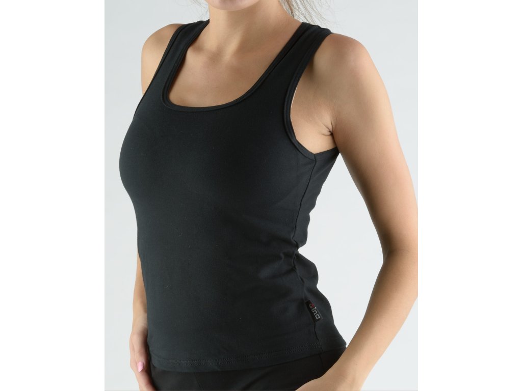Tílko do pasu se širšími ramínky, dámské šité sportovní prádlo. Průramky a průkrčník jsou začištěny lemovacími proužky. Tílko je jednobarevné. V bočním kraji je všité logo. Materiál je vyroben z bavlny, která je doplněna Lycrou. Úplet je vhodný pro všechny, kteří hledají přírodní materiály. Lycra přidává materiálu pružnost a zlepšuje jeho tvarovou stálost. Prádlo z tohoto materiálu je vhodné pro každodenní nošení.