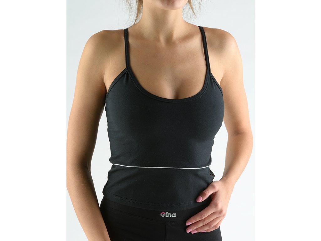 Košilka do pasu s úzkými ramínky, dámské šité sportovní prádlo. Průramky a průkrčník jsou začištěny lemovacími proužky, které přechází do ramínek. Přední díl je členěný pod prsy. Košilka je jednobarevná s kontrastní paspulí v členícím švu. V bočním kraji je všité logo.
