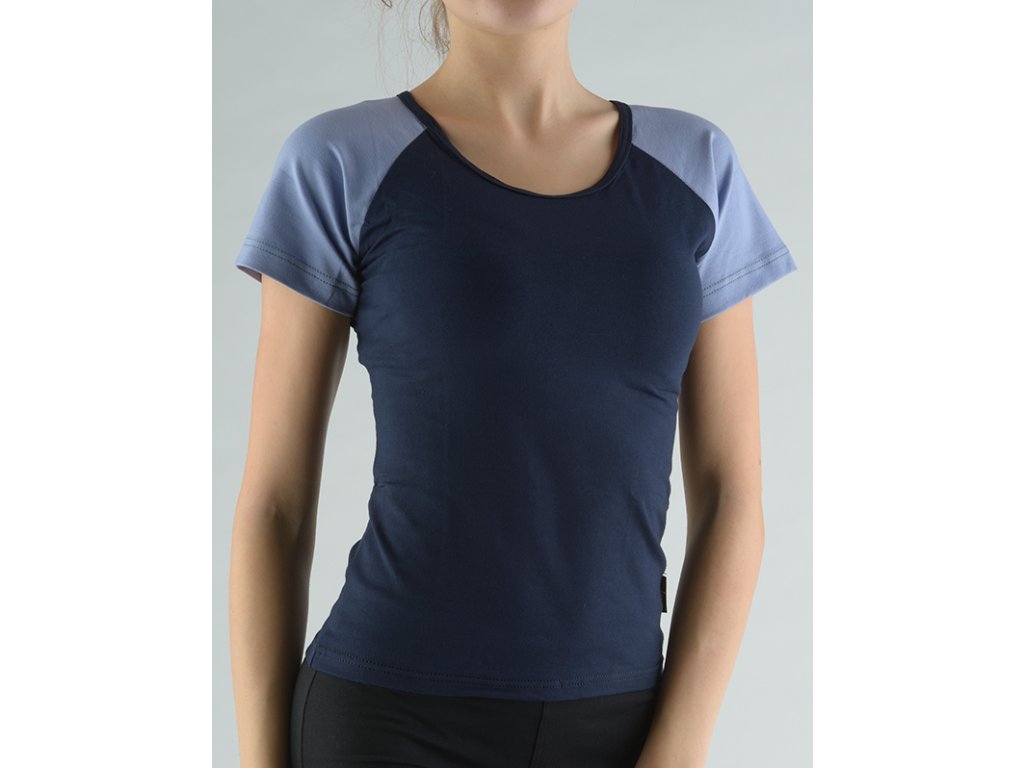 Tričko do pasu s krátkým rukávem, dámské šité sportovní prádlo. Výstřih je kulatý. Tričko je jednobarevné s kontrastními rukávy.