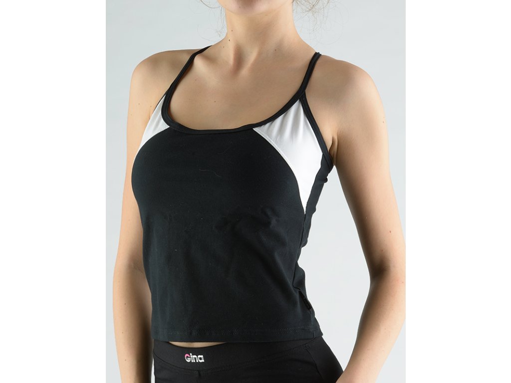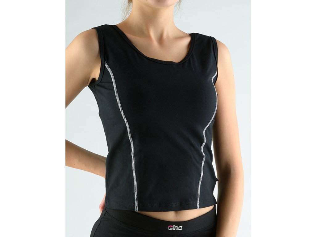Tílko do pasu se širšími ramínky, dámské šité sportovní prádlo. Průramky a průkrčník jsou začištěny lemovacími proužky. Tílko je jednobarevné s kontrastním prošitím na předním díle. V bočním kraji je všité logo.