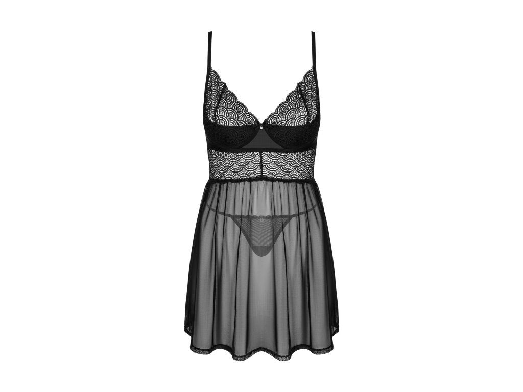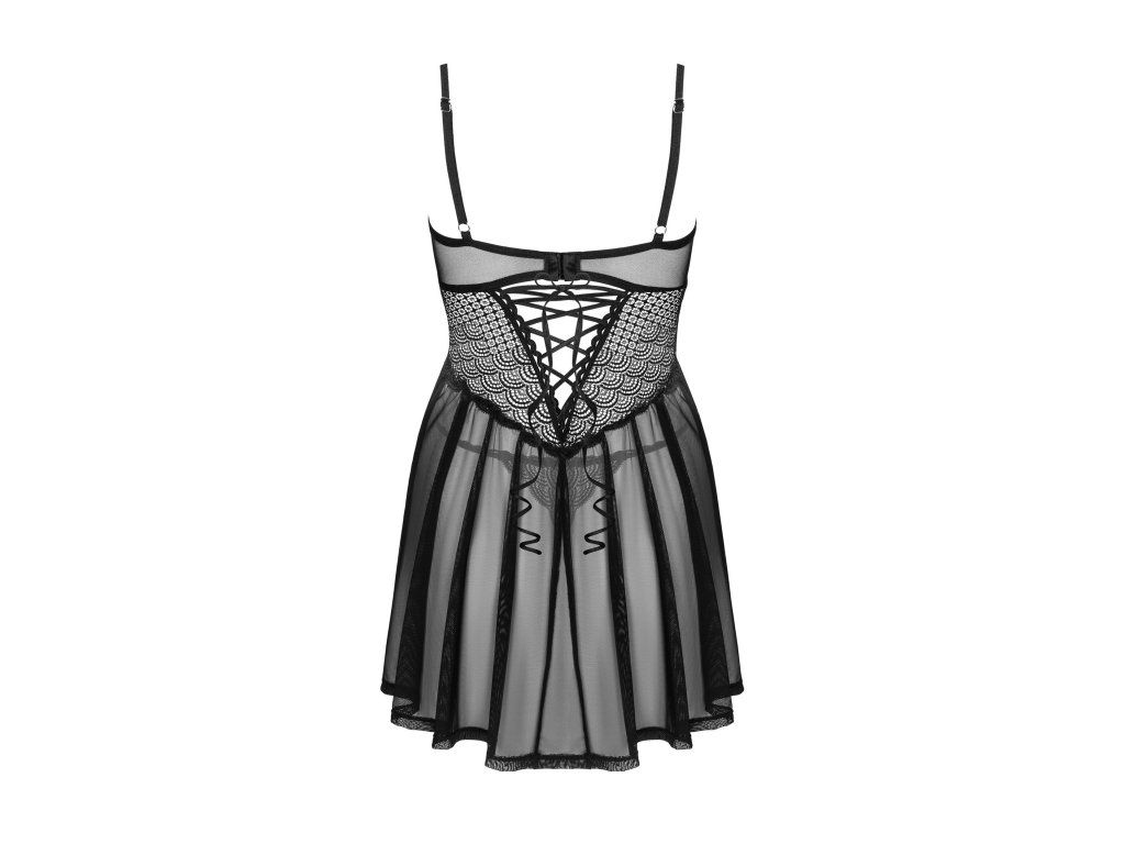 Košilka Chemeris ● v černé barvě ● černá tanga součástí košilky ● nastavitelné šněrování na zádech ● ramínka a vícestupňové zapínání ● zaručeno perfektní střih ● zpevněné košíčky s kosticemi – perfektní zdůraznění poprsí ● unikátní krajkové ozdoby – přitahují pozornost ● průhledná tkanina s vysokou elasticitou