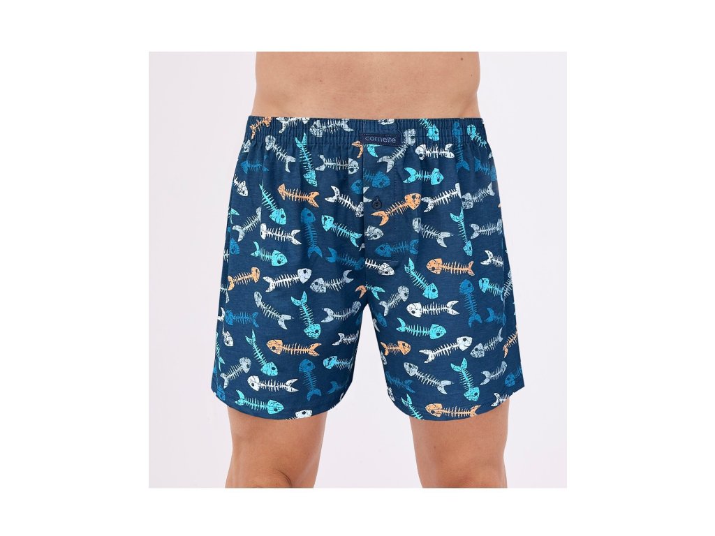 Boxerky Classic 001/171 ● v tmavě modré barvě s veselými vzory rybích kostlivců ● volný střih ● z vysoce kvalitní bavlny ● dobře poslouží jako tradiční spodní prádlo i na spaní ● pohodlné, pohodlný, široký elastický pas lemovaný měkkým materiálem ● zapínání na knoflíky ● úplet je mimořádně jemný k pokožce, příjemný na dotek ● přírodní bavlna, umožňuje pokožce volně dýchat ● zajistí naprostou volnost pohybu ● baleno v atraktivní krabičce ● ideální jako dárek