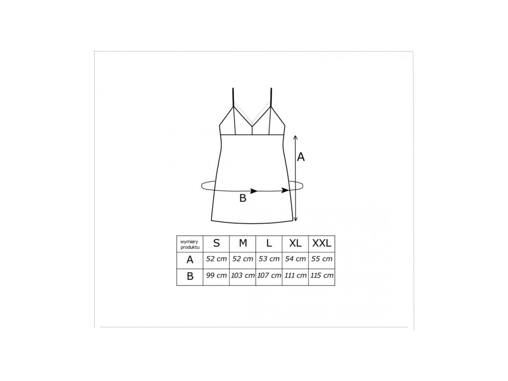 Košilka Candy II ● tenká, nastavitelná ramínka s přídavnými pásky ● přídavná ramínka sahají mezi prsa a zvýrazňují ženské půvaby ● černá síťovaná podprsenka, vyšívaná dvoubarevnými ornamenty ● střih pod poprsím a řasení ● hladká látka ve spodní části obkresluje pas, sahající do poloviny stehen ● baleno v elegantní krabičce
