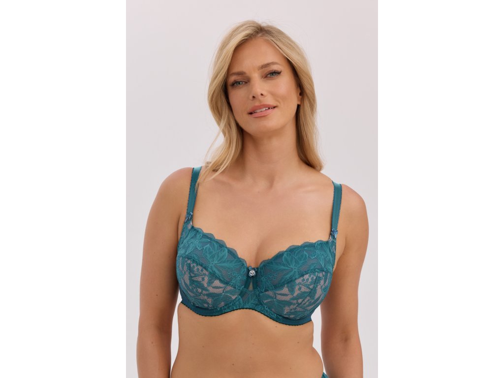 Měkká podprsenka Cassandra BSO 1355 zelená ● konstrukce S16, měkké košíčky ● určena pro ženy s velkými a velmi velkými prsy ● košíčky z krajky s květinovým motivem ● zespodu podšité vrstvou jemné látky a síťoviny ● zadní střih, ušitý z elastické látky, zadní střih, z elastického hladkého tylu, bez bočních velrybích kostic ● konstrukce velmi dobře podpírá, shromažďuje a tvaruje prsa ● v závislosti na velikosti dvouřadé nebo třířadé zapínání na háčky podšité mikrovláknem ● ramínka nastavitelná do tří poloh ● odepínací, nastavitelná ramínka ● zlaté detaily a mašlička s bižuterním akcentem podtrhují luxusní styl