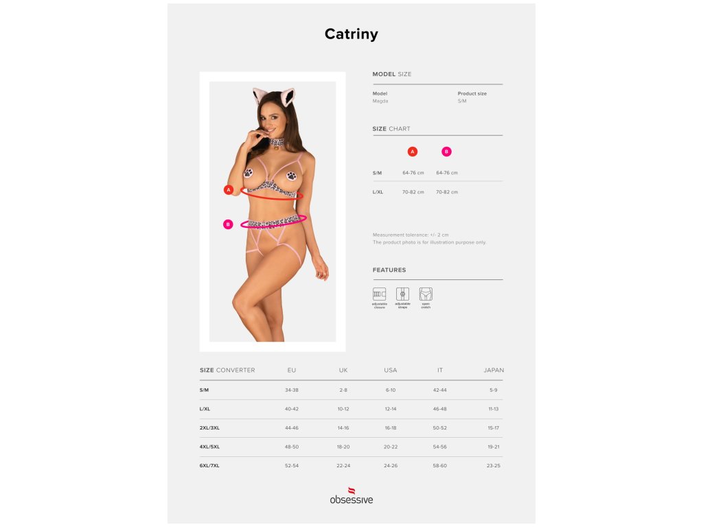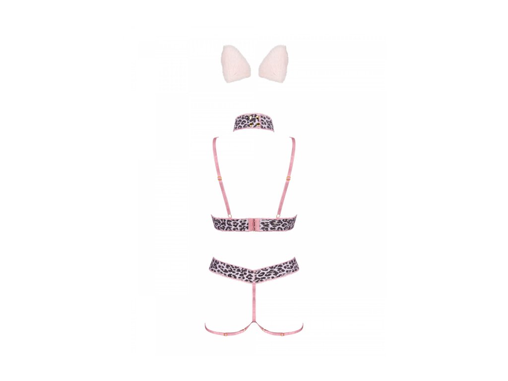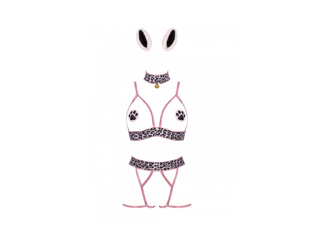 Kostým Catrina je nabídkou pro milovníky pikantních oblečků. Otevřená podprsenka a kalhotky odvážně odhalí vaši postavu a dodají jí sex-appeal. Doplňky v podobě bradavek, chokeru a náušnic vytvoří styling s wow efektem. Kostým Catrina obsahuje: otevřenou podprsenku, otevřené kalhotky, uši, choker a bradavky. Nastavitelná ramínka podprsenky a pohodlné zapínání na zádech - perfektně padnou. Tenká ramínka pro zvýraznění siluety - velmi sexy vzhled. Choker se zlatým přívěskem - zajímavý doplněk. Sladěné bradavky - dodají pikantnost.