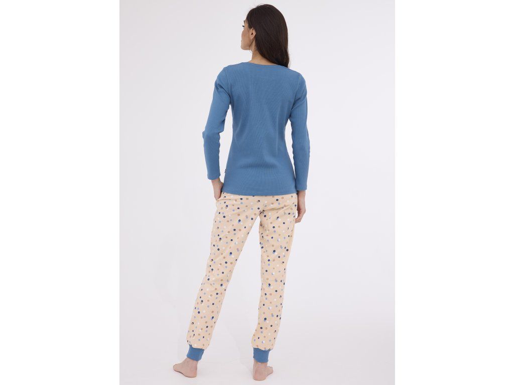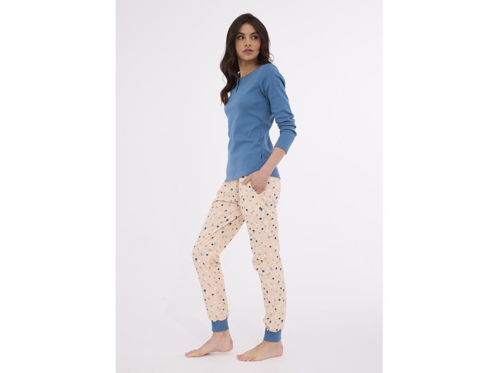 Dámské pyžamo 723/380 Sammy ● z vysoce kvalitní bavlny ● halenka s dlouhými rukávy v jednobarevné modré barvě ● top z žebrovaného úpletu, vrchní díl je vyroben z žebrovaného úpletu, díky němuž dokonale přiléhá k tělu ● půlkulatý výstřih zapínaný na 2 patentky ● součástí soupravy jsou dlouhé béžové kalhoty s barevnými puntíky ● pohodlný pružný pas lemovaný bavlnou ● dvě kapsy na bocích ● nohavice jsou zakončeny žebrováním v kontrastní barvě ● souprava je zabalena v pěkné krabičce ● využitelná také jako praktický dárek