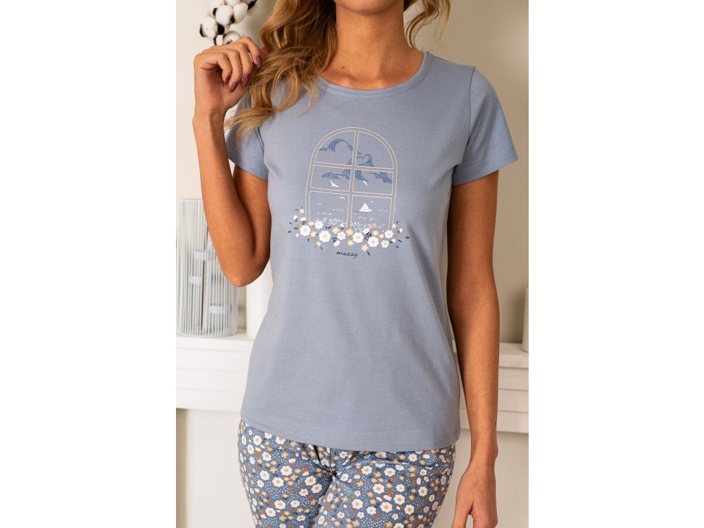 Pohodlné bavlněné pyžamo ● šedá halenka s krátkým rukávem a kulatým výstřihem ● na halence je natištěno okénko a jemné květy ● pohodlné šedé kalhoty v délce ke kolenům ● s potiskem bílých a béžových květů ● s elastickým pasem a krásnou bílou mašlí