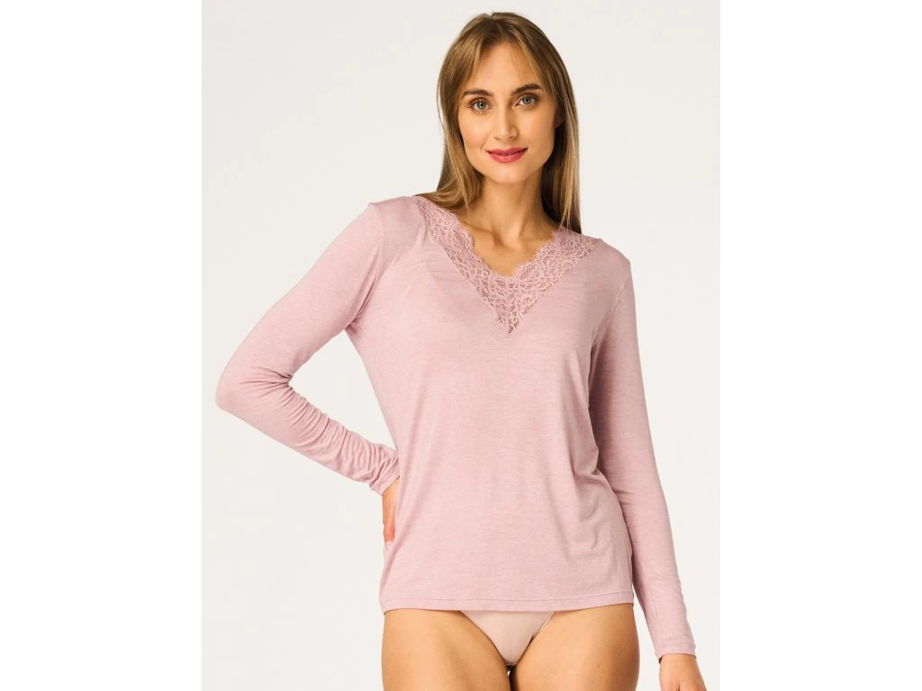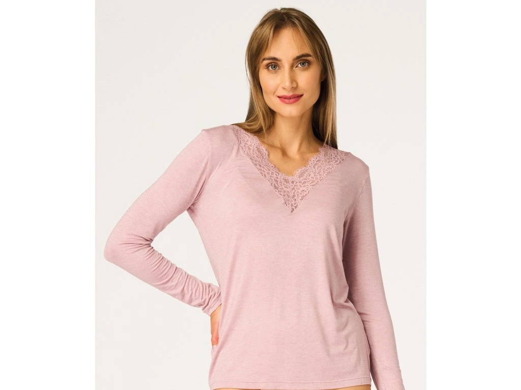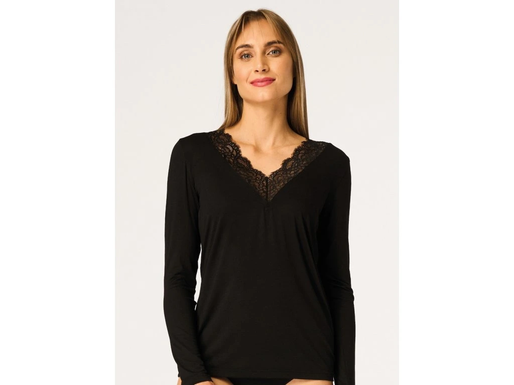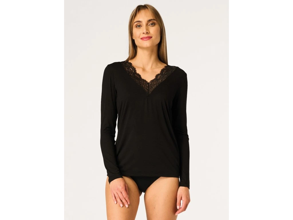 Dámské tílko LVD 129 ● Pohodlná krajková halenka ● Pohodlný, zavinovací spodní díl s elegantním krajkovým akcentem ● Vyrobeno z kombinace modalu, merino vlny a elastanu ● Měkký, teplý a k pokožce příjemný úplet ● Výstřih do V zdobený krajkovou vsadkou ● Praktické dlouhé rukávy ● Ideální jako základní vrstva do chladnějších dnů ● Baleno v elegantní krabičce