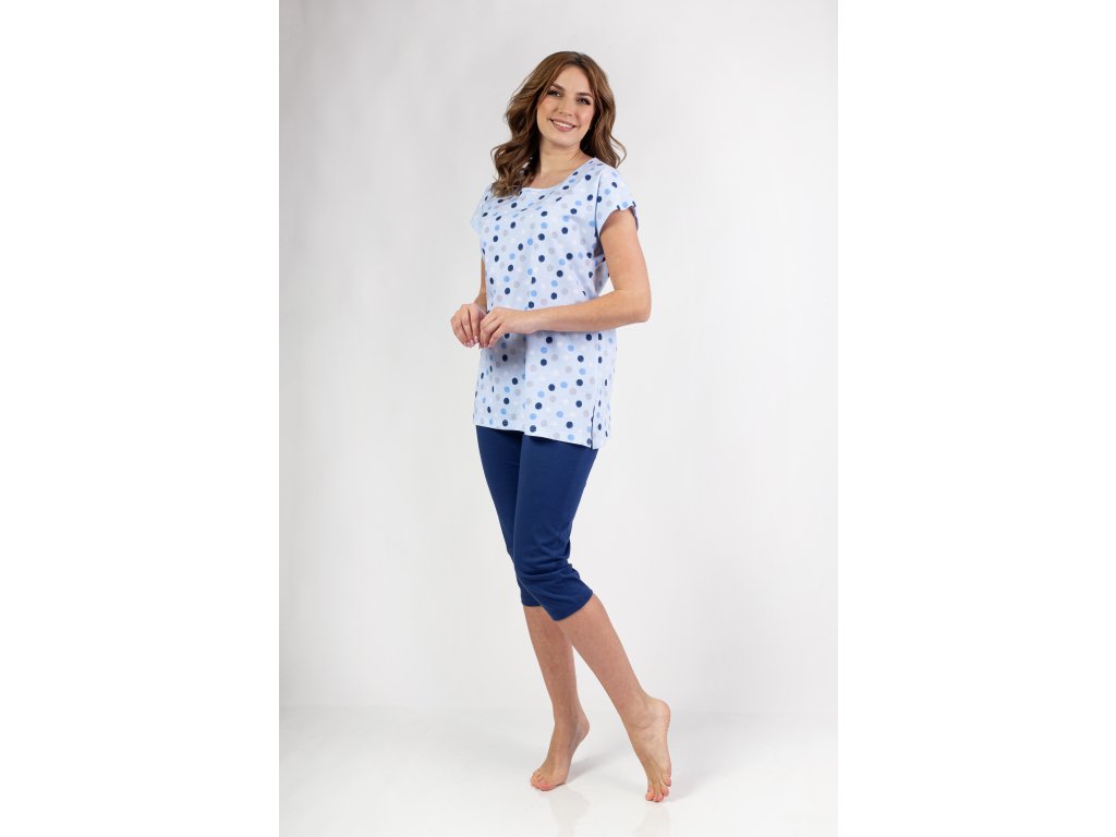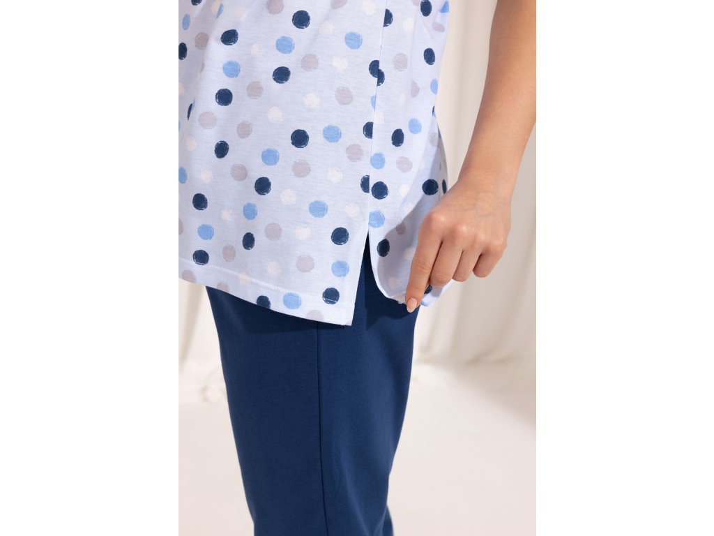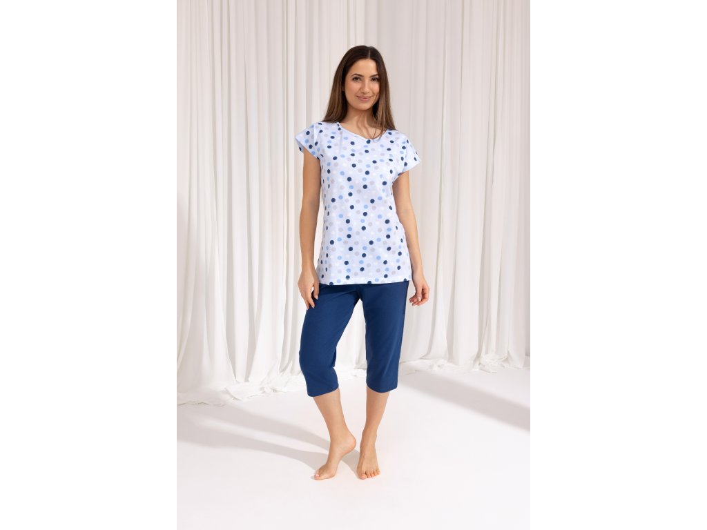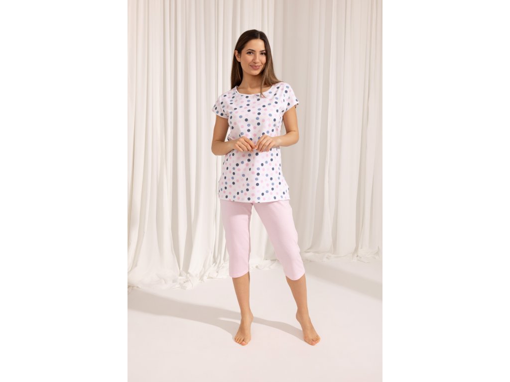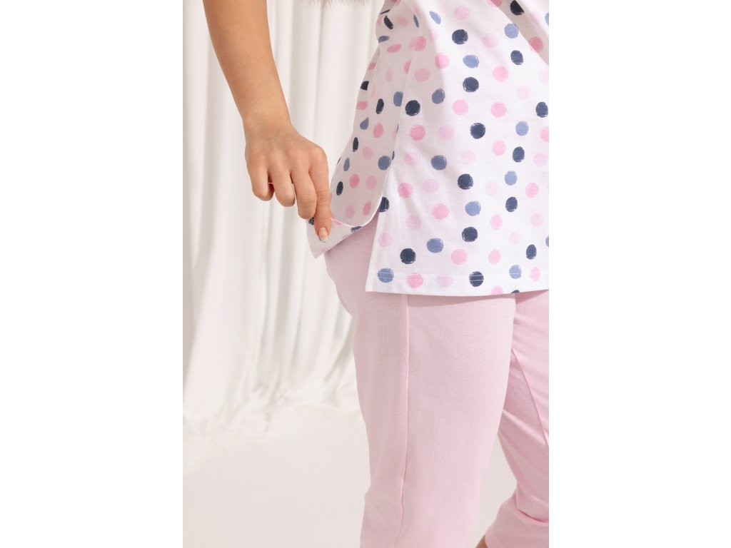 Dámské pyžamo 690 ● z bavlny příjemné na dotek ● tričko s krátkým rukávem a barevnými kostkami ● kulatý výstřih s lemováním ● boční rozparky ve spodní části ● jednobarevné kalhoty ● 3/4 délky nohavic ● v pase bavlněná guma
