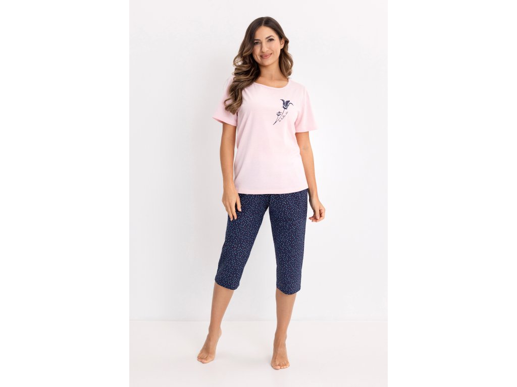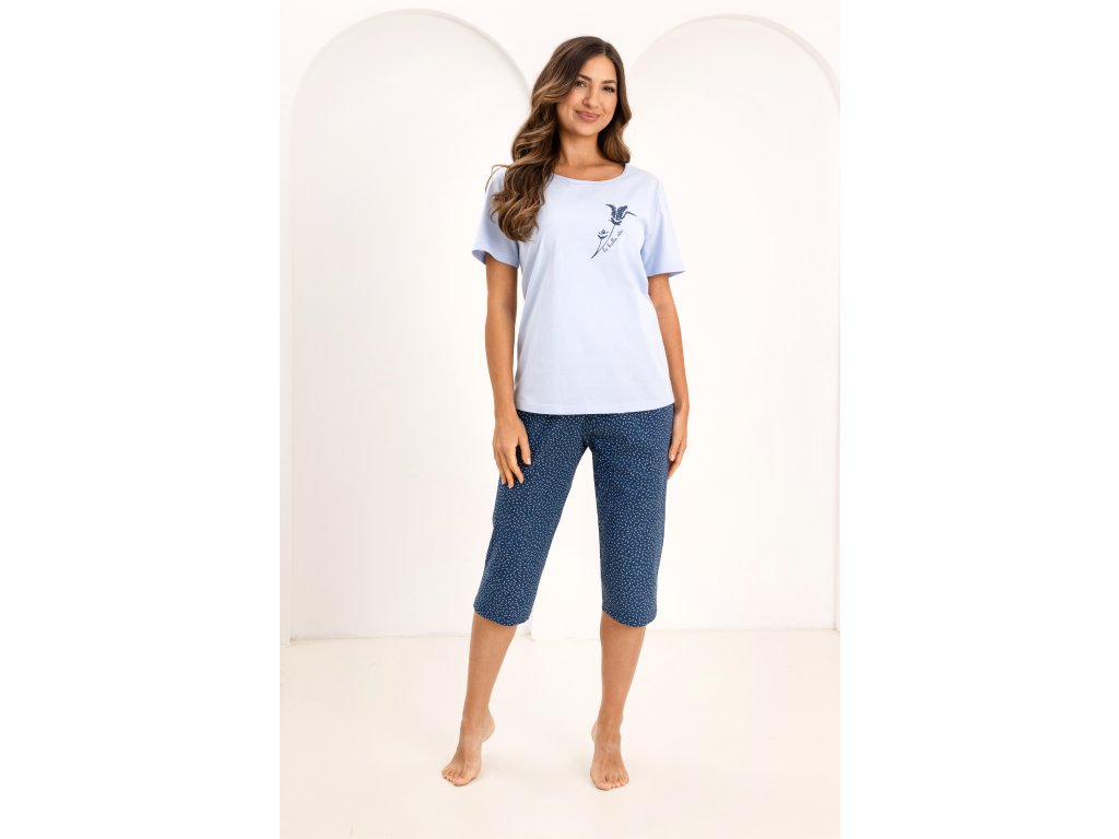 Dámské pyžamo 731 ● vyrobeno z vysoce kvalitní bavlny ● pevné tričko s krátkým rukávem ● ozdobný potisk květin na levé straně ● půlkruhový výstřih ● vzorované 3/4 kalhoty do soupravy ● sáčkované