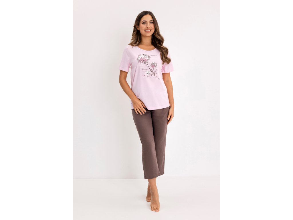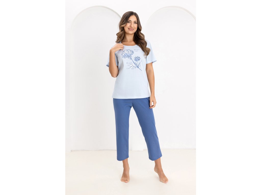 Dámské pyžamo 734 ● z vysoce kvalitní bavlny ● tričko s krátkým rukávem ● přední díl zdobený potiskem ● půlkruhový výstřih ● jednobarevné kalhoty ● 7/8 nohavice ● elastický pas lemovaný bavlnou ● sáčkované
