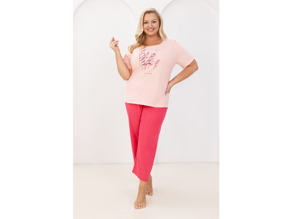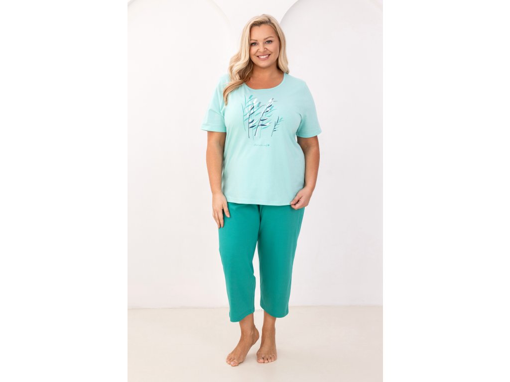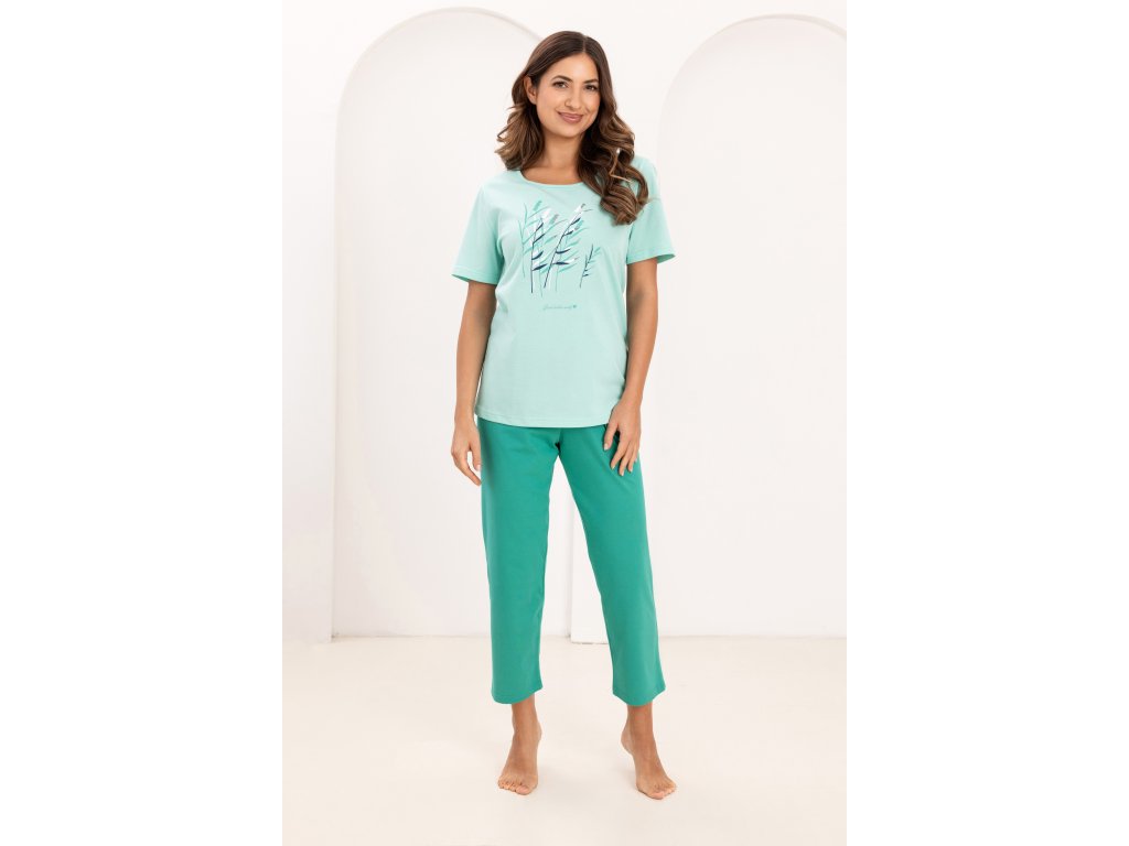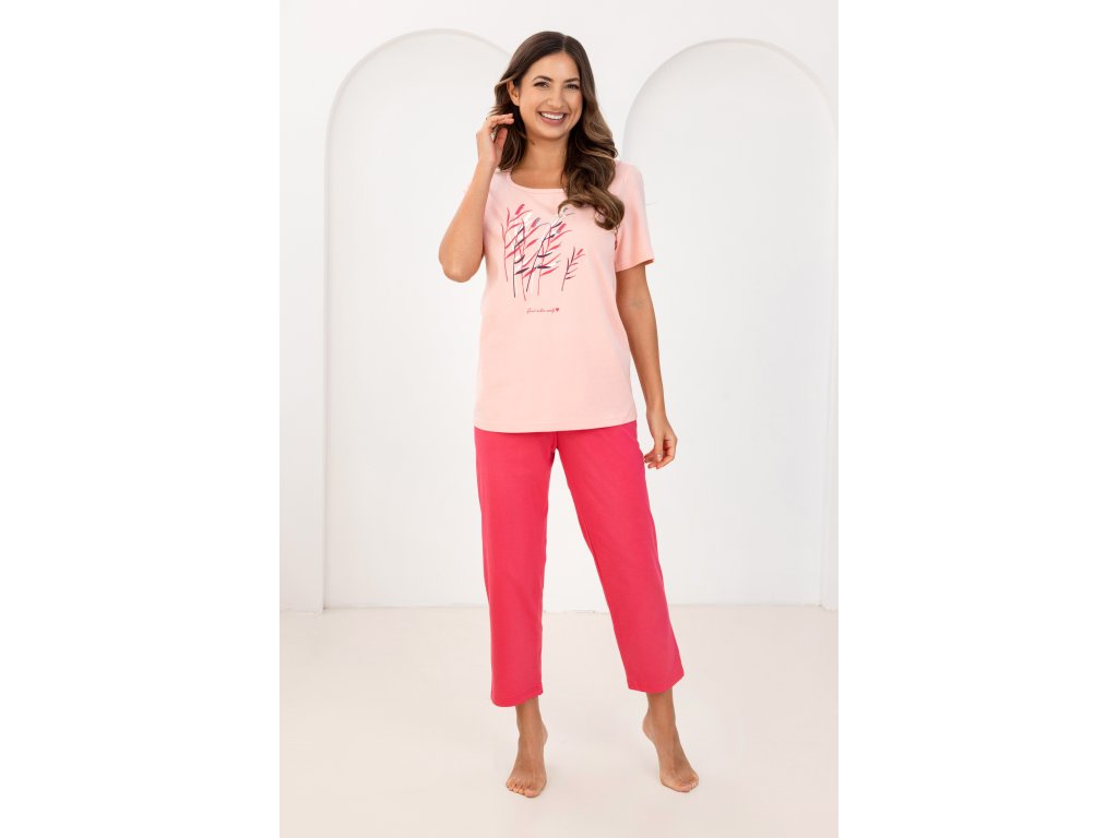 Dámské pyžamo 740 KR ● vyrobeno z vysoce kvalitní, měkké a prodyšné bavlny ● tričko s krátkým rukávem, ideální pro teplejší dny a noci ● přední stranu trička zdobí poutavý potisk ● půlkruhový výstřih pro pohodlné nošení ● kontrastní kalhoty se 7/8 délkou nohavic, které doplňují komplet ● látka příjemná na dotek, jemná k pokožce ● ideální na spaní i domácí odpočinek ● baleno v estetickém sáčku