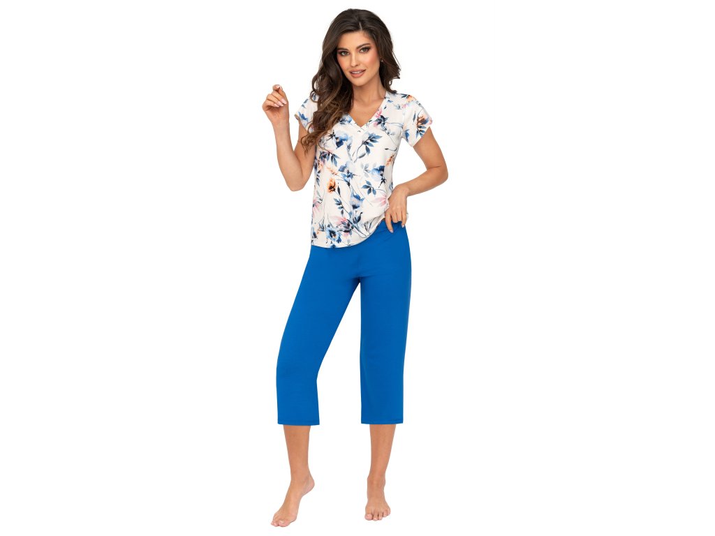 Dámské pyžamo Astrid 3/4 ● celé z viskózy ● halenka s květinovým vzorem v modrých odstínech ● výstřih do V ● klasické krátké rukávy ● kalhoty v chrpové barvě ● 3/4 délka, ležérní střih ● baleno v plastovém sáčku