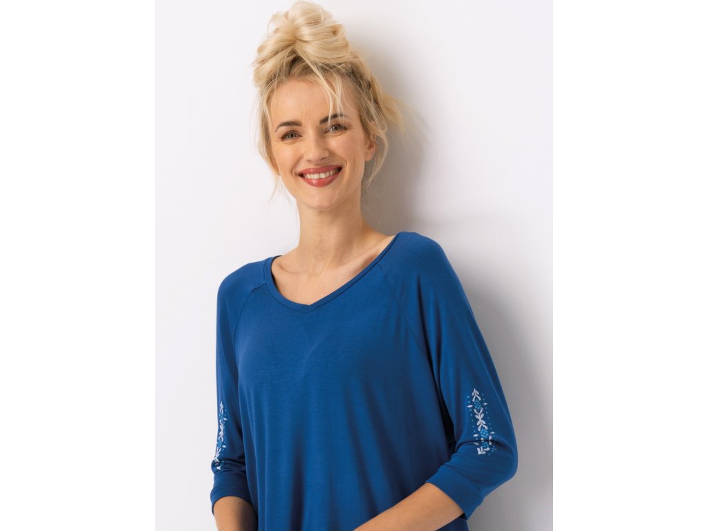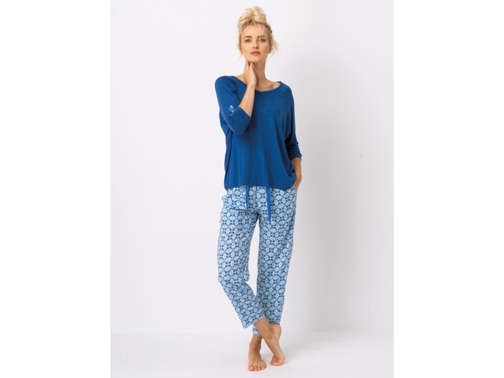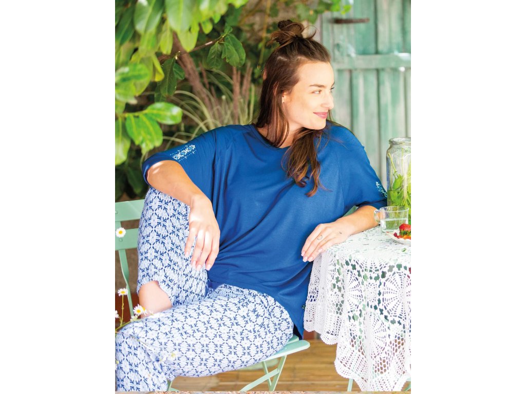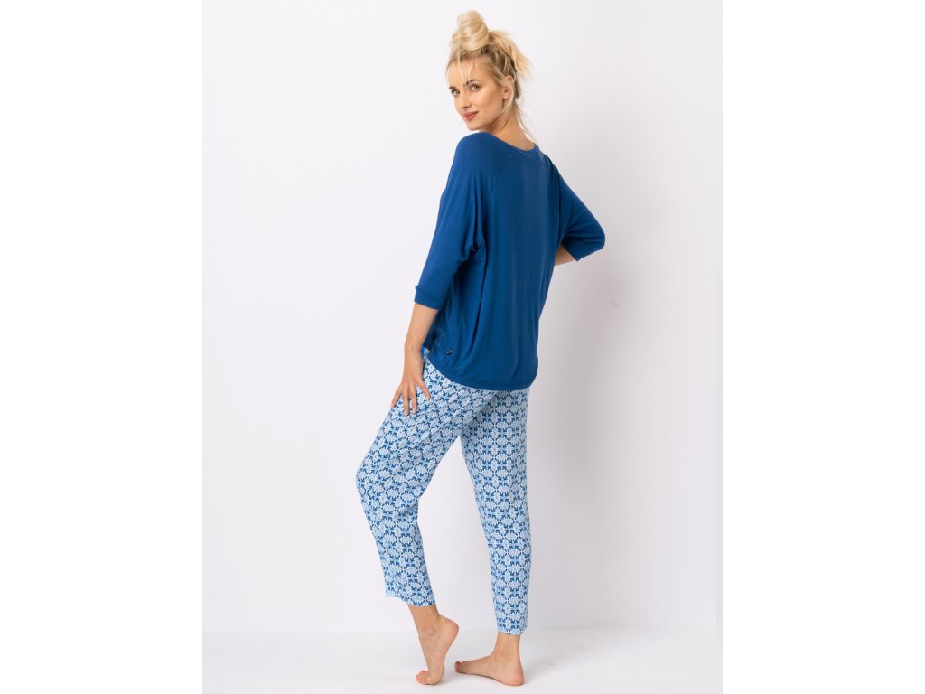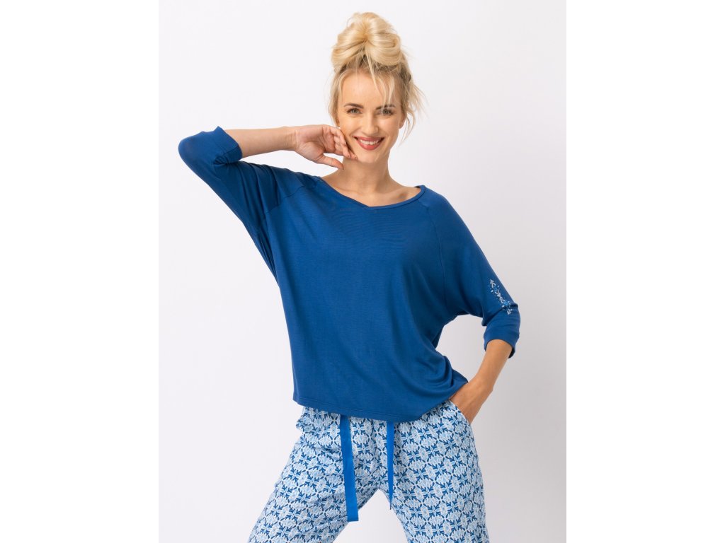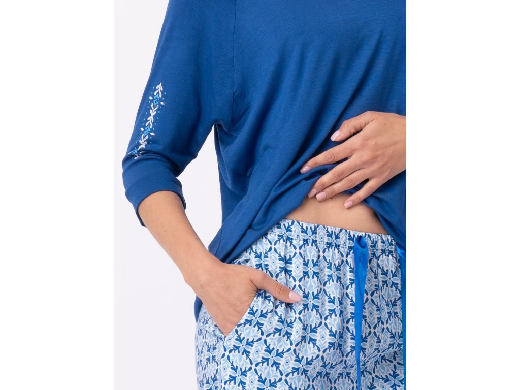 Dámské pyžamo LNS 721 ● viskózové etno pyžamo s 3/4 rukávy ● v barvách modré, tmavě modré a čistě bílé ● viskózový úplet s elastanem v blůze ● volný střih, otevřeným, žensky hlubokým výstřihem do V ● mírně zúžené kalhoty z viskózové tkaniny ● v pase měkká guma a ozdobná páska s kapsami na bocích ● nohavice po kotníky ● velmi pohodlný komplet ● skvělý pro každodenní nošení doma