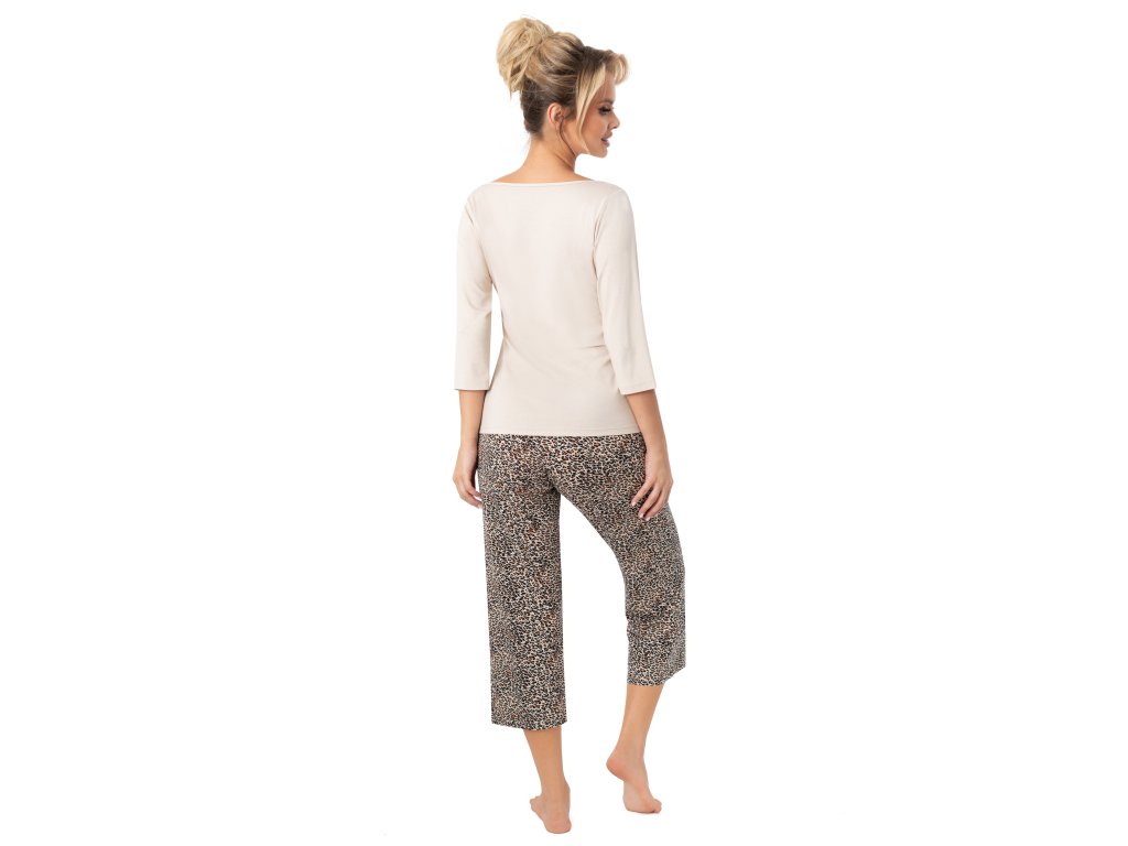 Dámské pyžamo Omari 3/4 ● z vysoce kvalitní přírodní viskózy ● halenka, jednobarevná béžová ● 3/4 rukávy, lodičkový výstřih ● kalhoty ve 3/4 délce, klasický střih ● kalhoty celé v leopardím vzoru