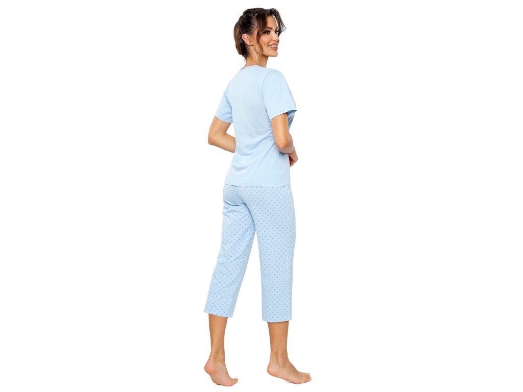 Dámské pyžamo Sky 3/4 ● z vysoce kvalitní bavlny ● jednobarevná modrá halenka ● půlkulatý výstřih ● krátké mírně prodloužené rukávy ● kalhoty s puntíky ve 3/4 délce ● baleno v plastovém sáčku
