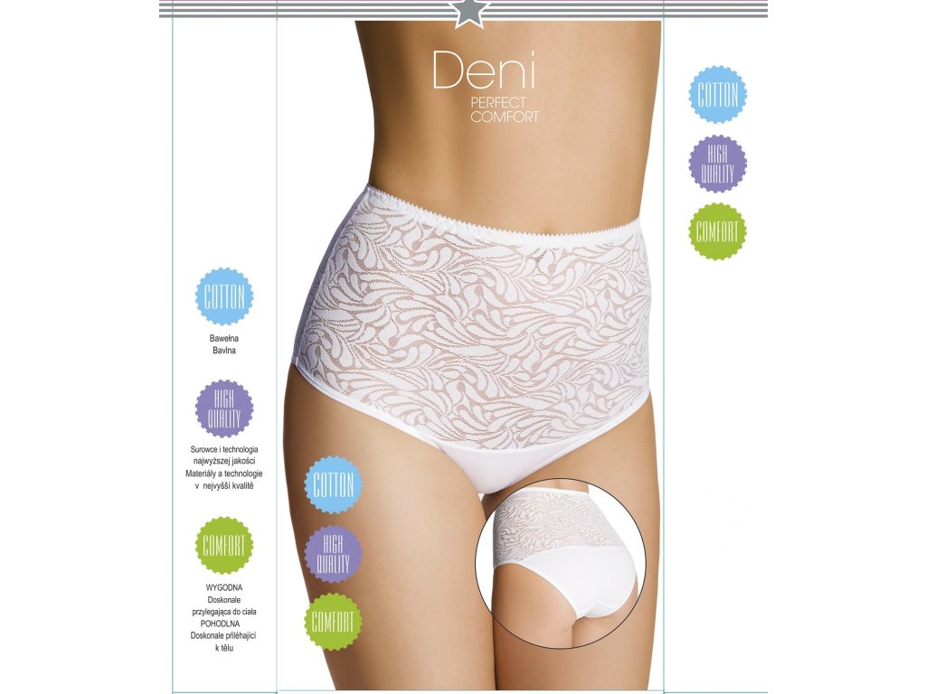 Spodní díl bikin Deni ● s vyšším pasem a vestavěnými boky ● horní díl z elegantní, ale pružné krajky ● spodní díl z měkké bavlny ● baleno v krabičce
