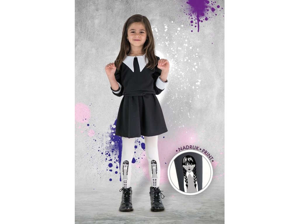 Tyto dívčí punčocháče inspirované televizním seriálem "Wednesday" musí mít každý fanoušek tohoto seriálu! Dívčí punčocháče jsou vyrobeny z měkkého, neprůhledného, matného mikrovlákna s 3D technologií. Punčocháče mají zvýšenou odolnost proti poškození. Dokonale přilnou k nohám, aniž by způsobovaly nepohodlí. Punčocháče s dodatečným zesílením na prstech.