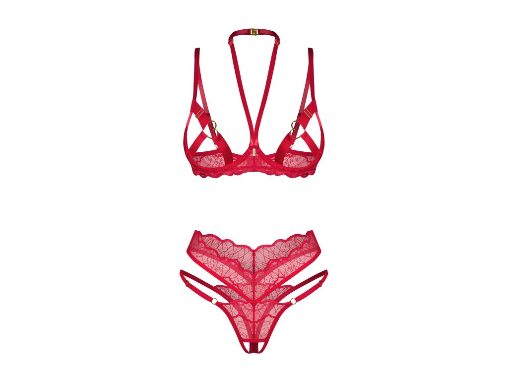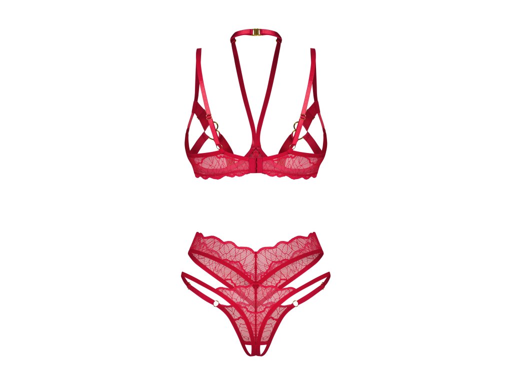 Dvoudílná sada Cupide Desir ● sada otevřeného střihu ● skládá se z podprsenky a tang s vysokým pasem ● měkká krajka je kombinována se širokými ramínky na poprsí ● konektory ve tvaru srdce a elastické lemování ● četné úpravy zaručují dokonalé přizpůsobení a atraktivní vzhled ● pásek na krk ● zlatá visačka s nápisem Obsessive ● nastavitelné pásky tang a ramínek ● zapínání na háčky a oči v několika krocích