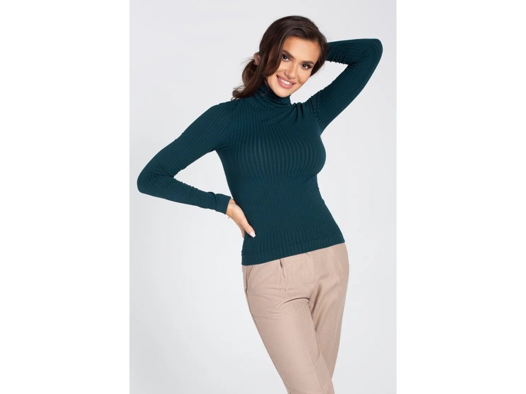 Rolák klasického střihu, který lze libovolně stylizovat. Perfektně se hodí k nejnovějším trendům a příjemně obepíná krk. Žebrovaný elastický materiál se přizpůsobí křivkám těla a jemně je odhalí. Svislý vzor jej zároveň opticky zeštíhluje. Rolák je vyroben z materiálu s vysokým podílem viskózy, který zaručuje tepelný komfort při nošení.