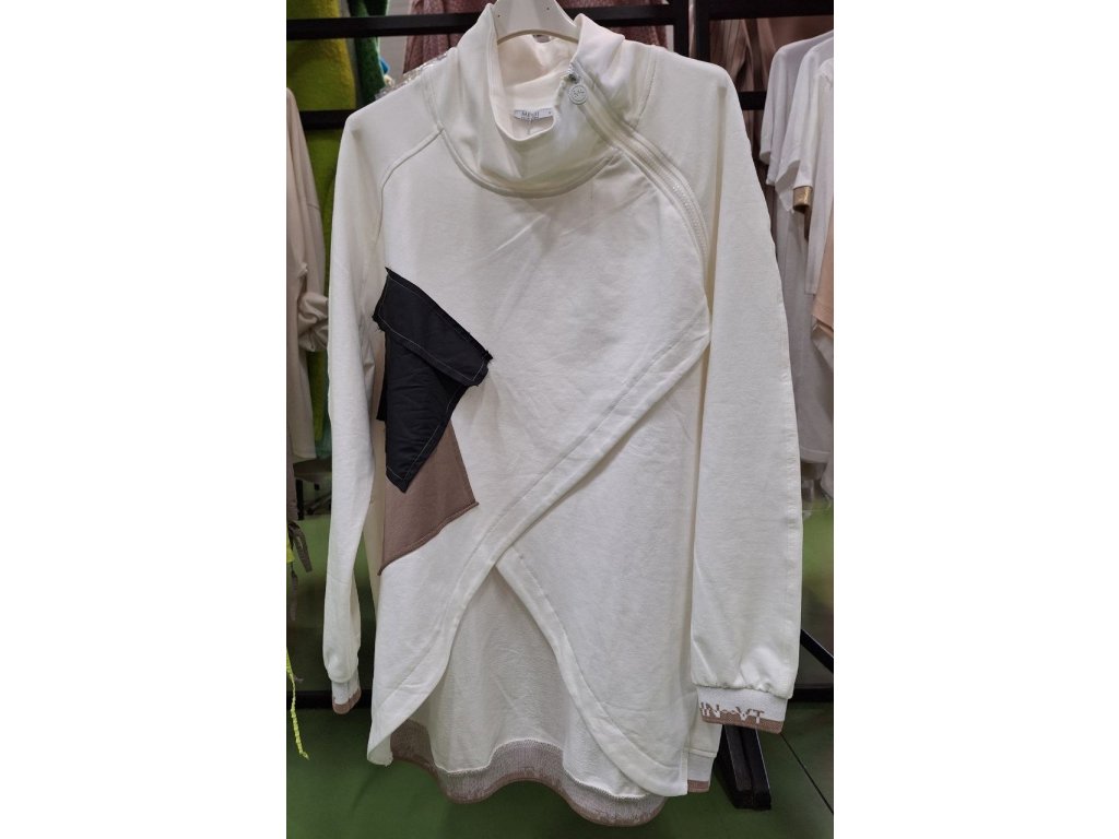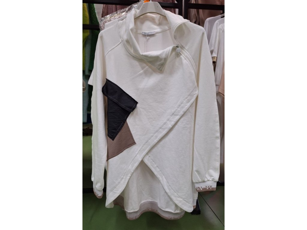 Bílá halenka 5577 ● delší zadní část vám umožní kombinovat ji s pohodlnými legínami ● můžete ji nosit také s džínami ● zdobená černou kapsou ● zip vám umožní odhalit krk ● střih je určen pro ženy plus size ● univerzální velikost