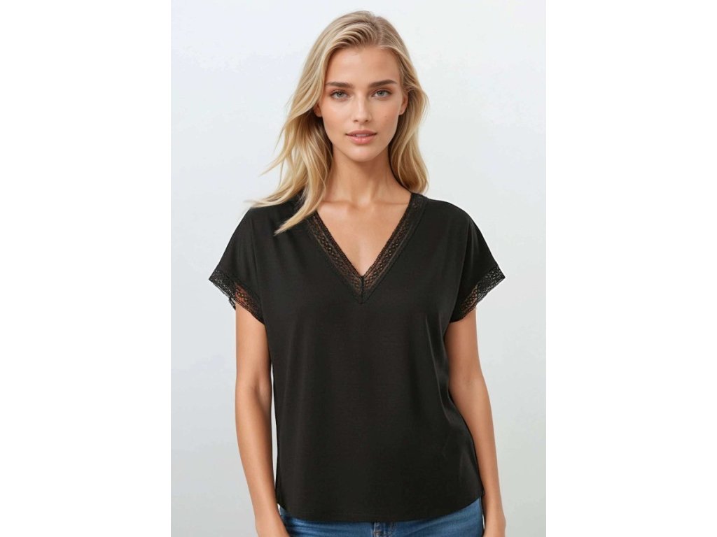 Flaviana Blouse Black ● kombinuje ležérní styl s jemnými, ženskými detaily ● výstřih do V zdobený prolamovanou páskou ● okraje krátkých rukávů jsou lemovány ozdobnou páskou ● přírodní materiál zaručuje vysoký komfort při nošení ● ležérní střih - volný střih, s krátkými kimonovými rukávy