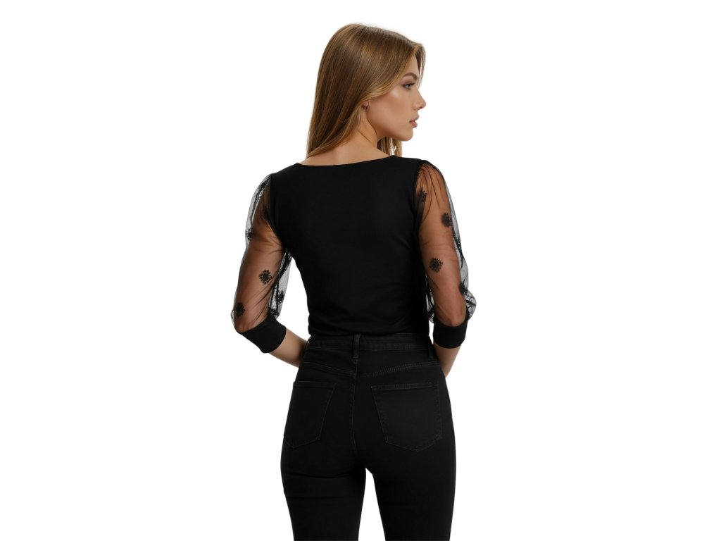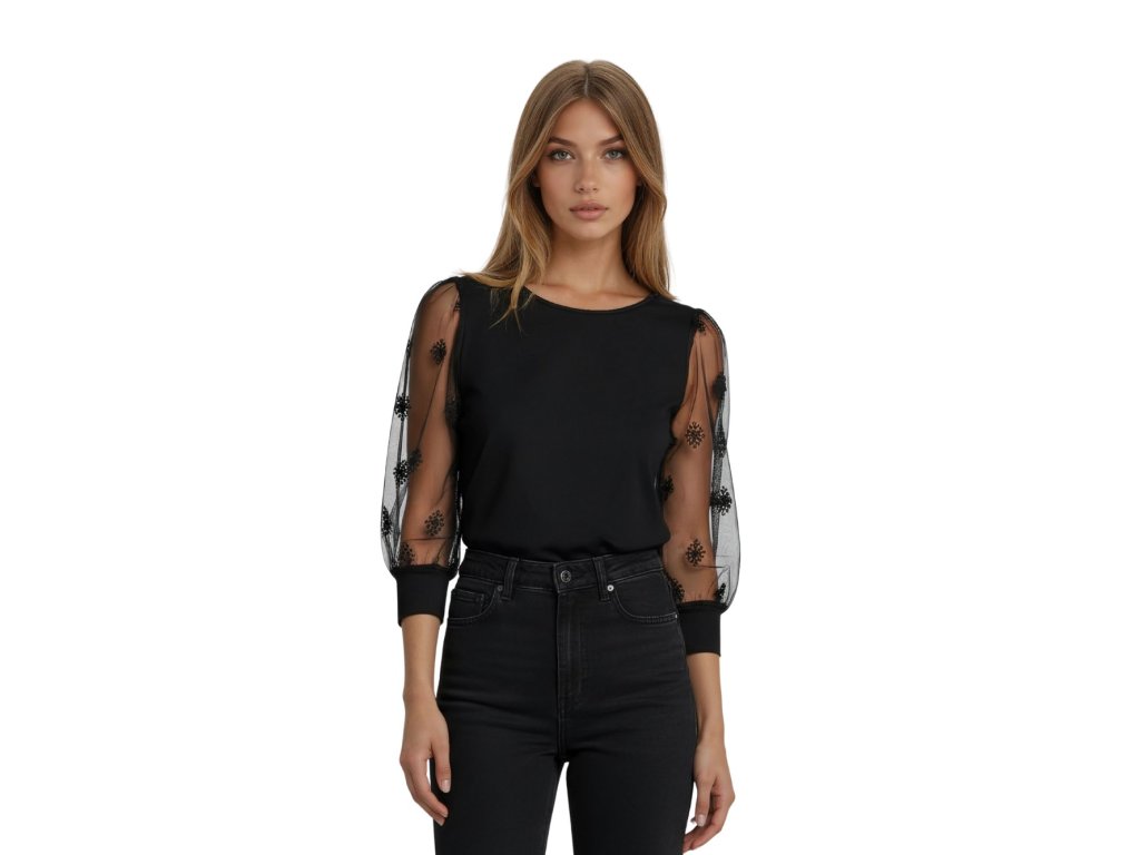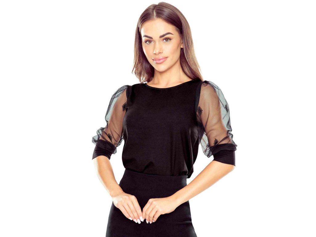 Halenka Teria Black ● poutavé poloprůhledné rukávy typu bufet z jemné síťoviny (tylu) ● rukávy zdobené drobnými vyšívanými aplikacemi ● rukávy zakončené širokou elastickou manžetou z hladkého materiálu ● manžety umožňují pohodlné nasazení rukávů v libovolné výšce ● minimalistické tělo s hladkou přední a zadní stranou ● klasika, klasický kulatý výstřih ● tělo z 90 % z viskózy pro prodyšnost, měkkost a pohodlí ● elastan pro dokonalé padnutí ● polyamid zpevňuje strukturu tylových rukávů ● univerzální styl, skvěle se kombinuje se sukněmi i kalhotami