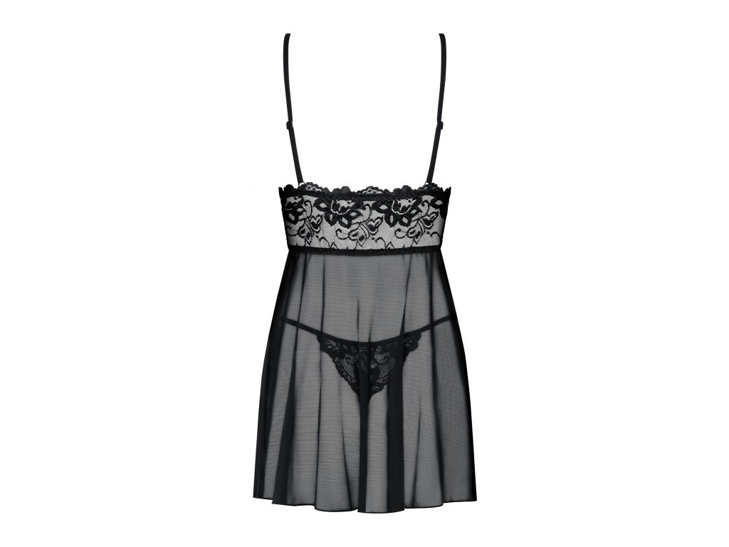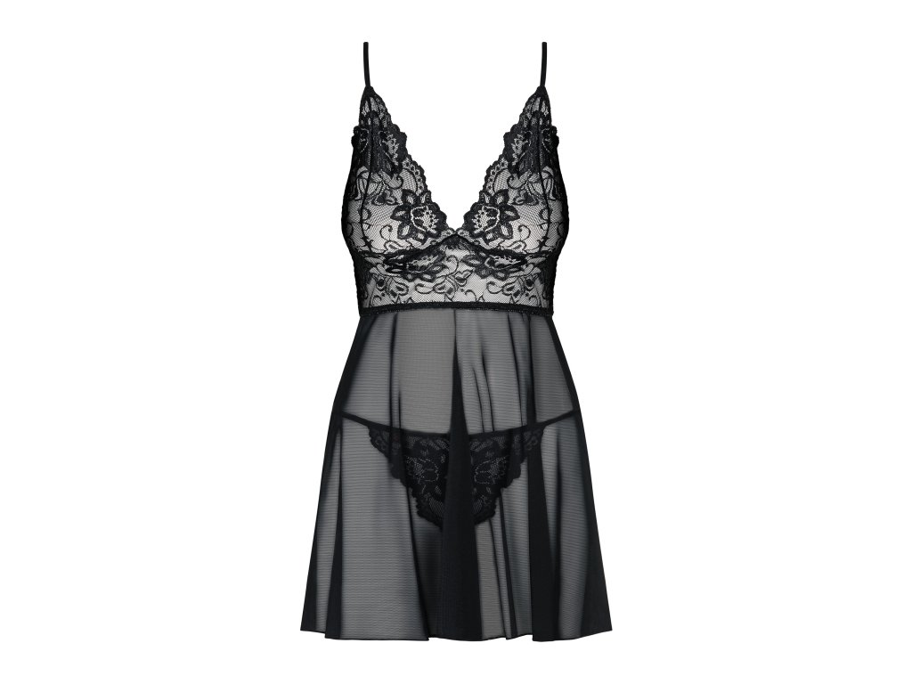 Idillia Babydoll set ● svůdná košilka a tanga s odpovídajícím krajkovým motivem ● průsvitná krajka s květinovým vzorem ● rozšířená, volně splývající košilka ● nastavitelná ramínka ● jemný a elastický materiál