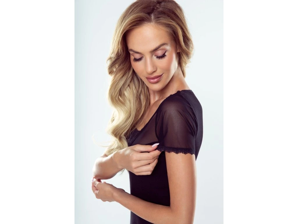 Tričko Prima ● s krátkým rukávem ● vyrobeno z kombinace bavlny, tylu a krajky ● průhledné rukávy zakončené krajkou ● výstřih do V částečně překrytý krajkovou vsadkou