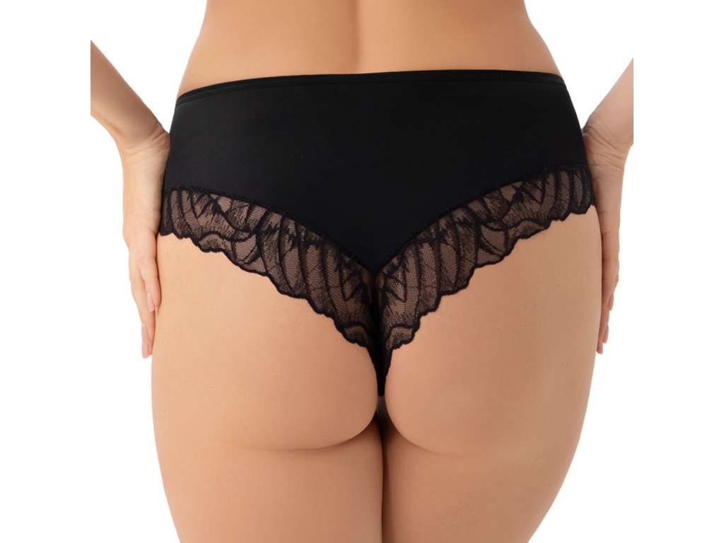 Kalhotky Brasil Ceila K955 Černá ● středně vysoký střih ● odhalují a zvýrazňují hýždě ● vyrobeny z neprůhledného mikrovlákna v kombinaci s elastickým tylem a krajkou ● zadní díl zakončen dvojitou síťovinou ● plisovaný pás zdobený uprostřed kovovým prvkem zlaté barvy (neobsahuje nikl) ● bavlněný rozkrok