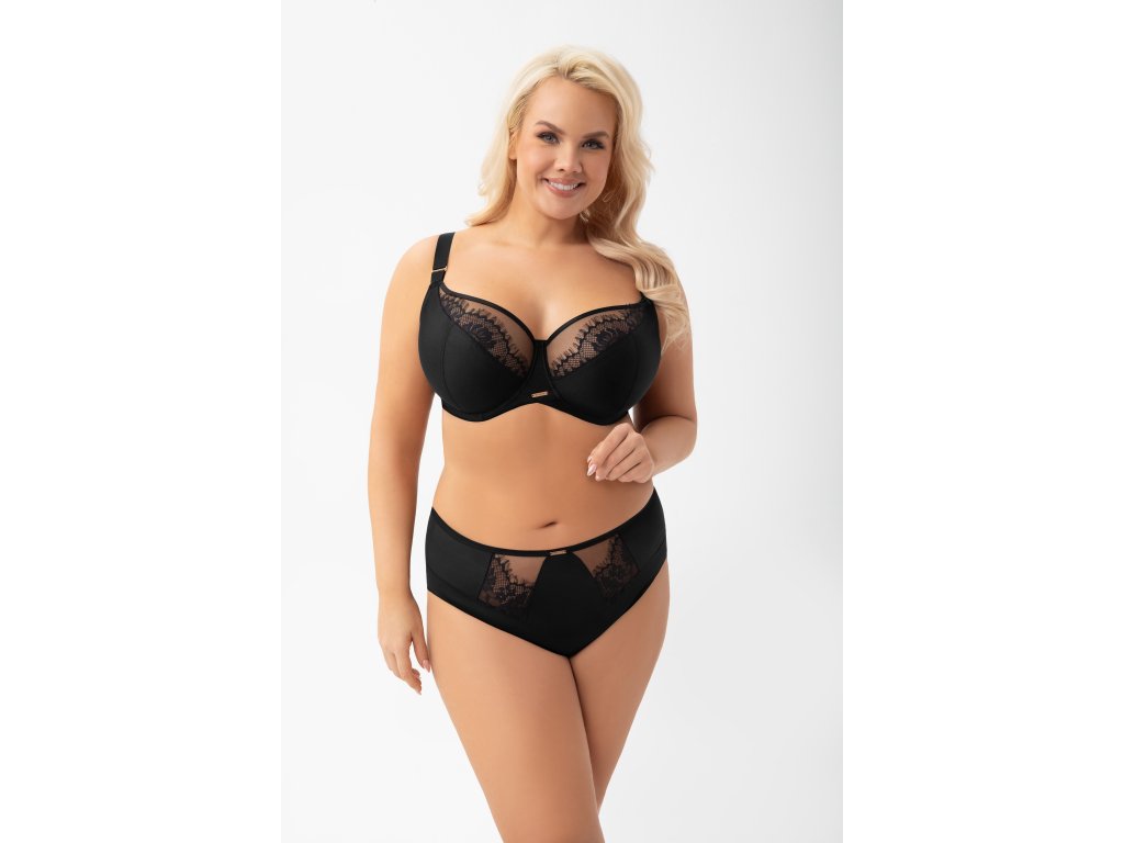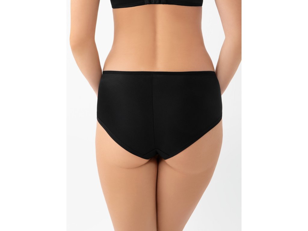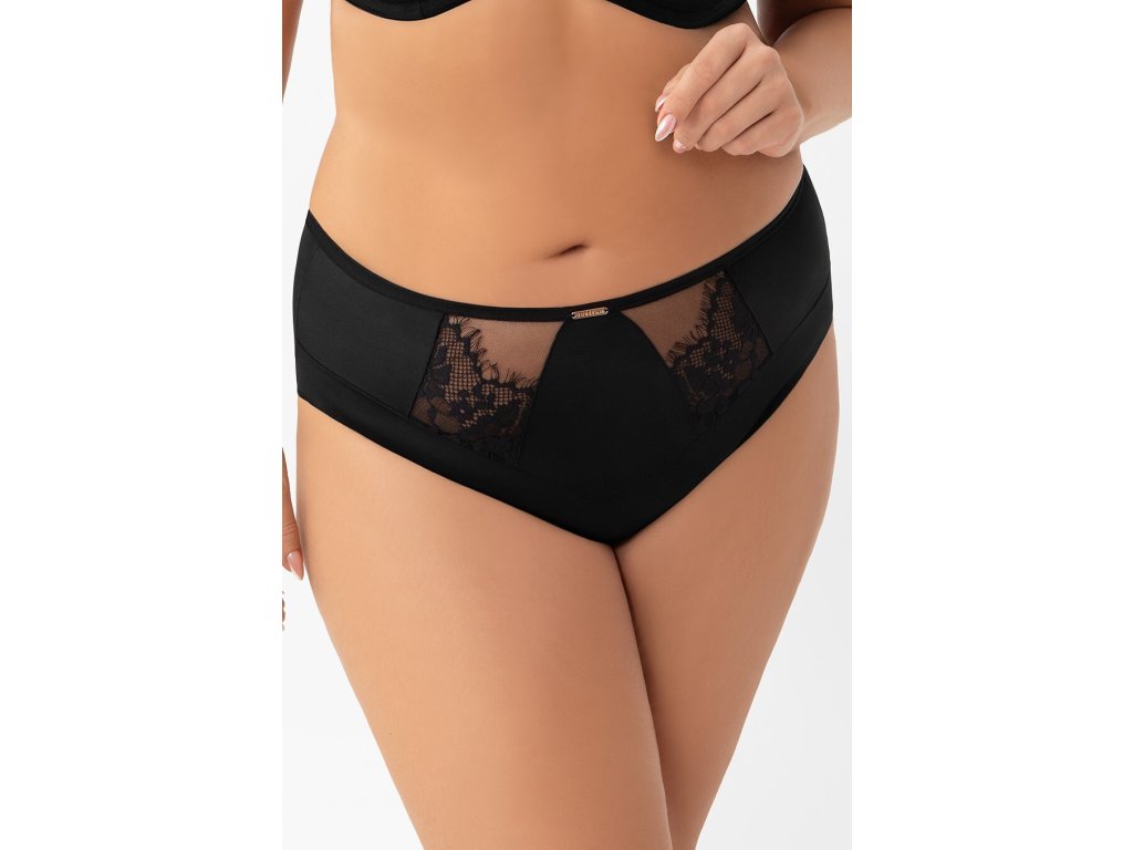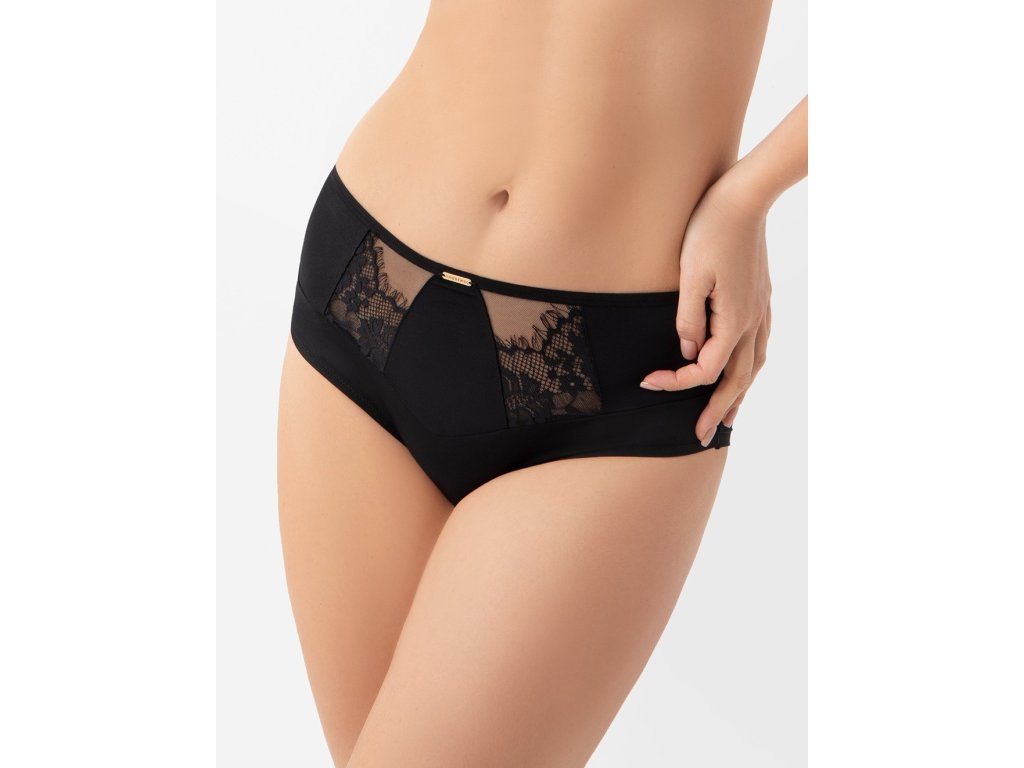 Evia K938 Černé bikiny ● vyšší horní díl ● vestavěný střih, který zakrývá téměř celý hýždě ● z neprůhledného mikrovlákna s krajkovými prvky na stabilním tylu ● zadní díl zakončený ohrnutím okraje mikrovlákna naplocho ● bavlněný rozkrok ● kovové prvky ve světle zlaté barvě (neobsahují nikl)