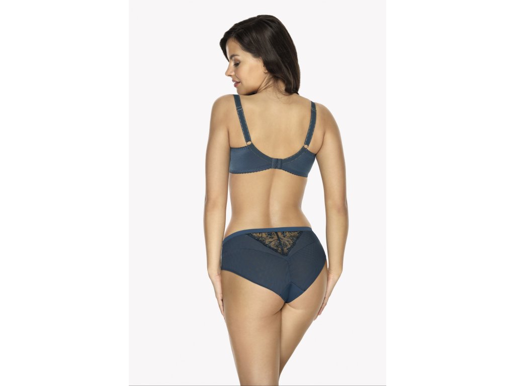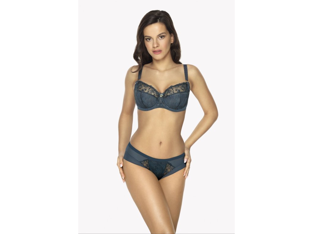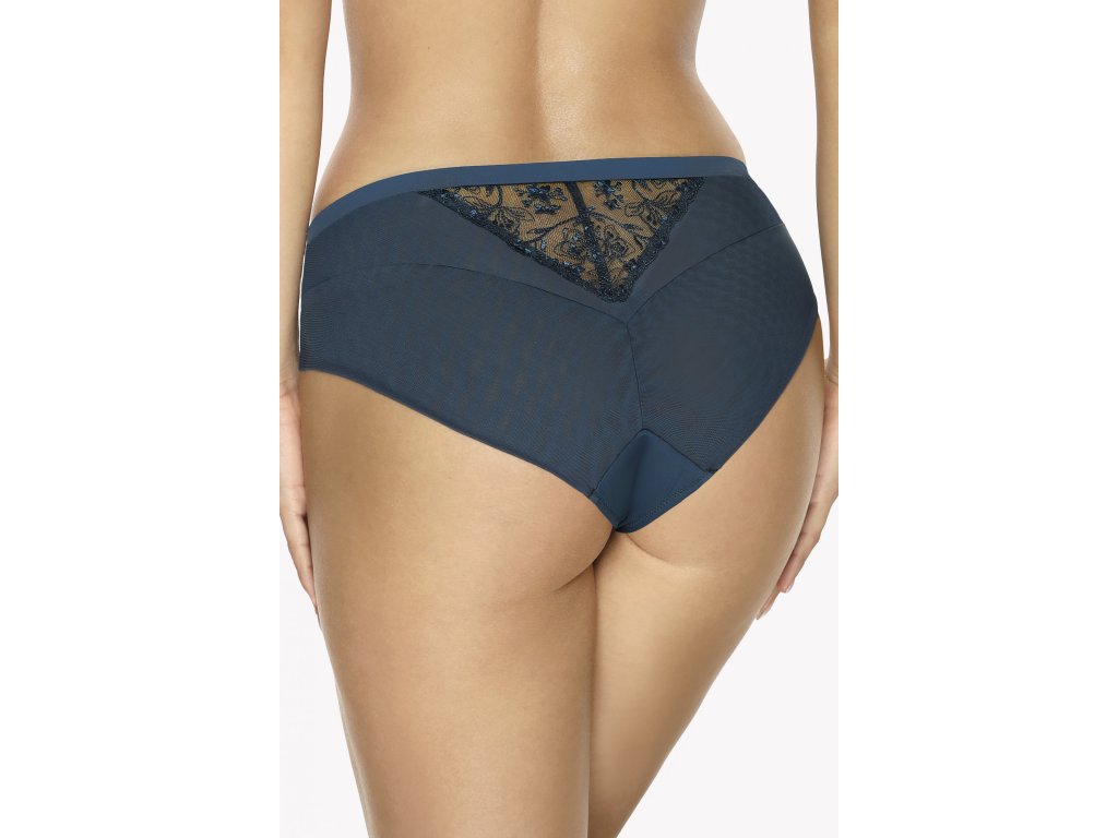 Kalhotky klasického střihu v modré barvě. Přední a zadní díl zdobí jemné krajkové vsadky s výšivkou. Pas je zakončen hladkou jednotnou stuhou.