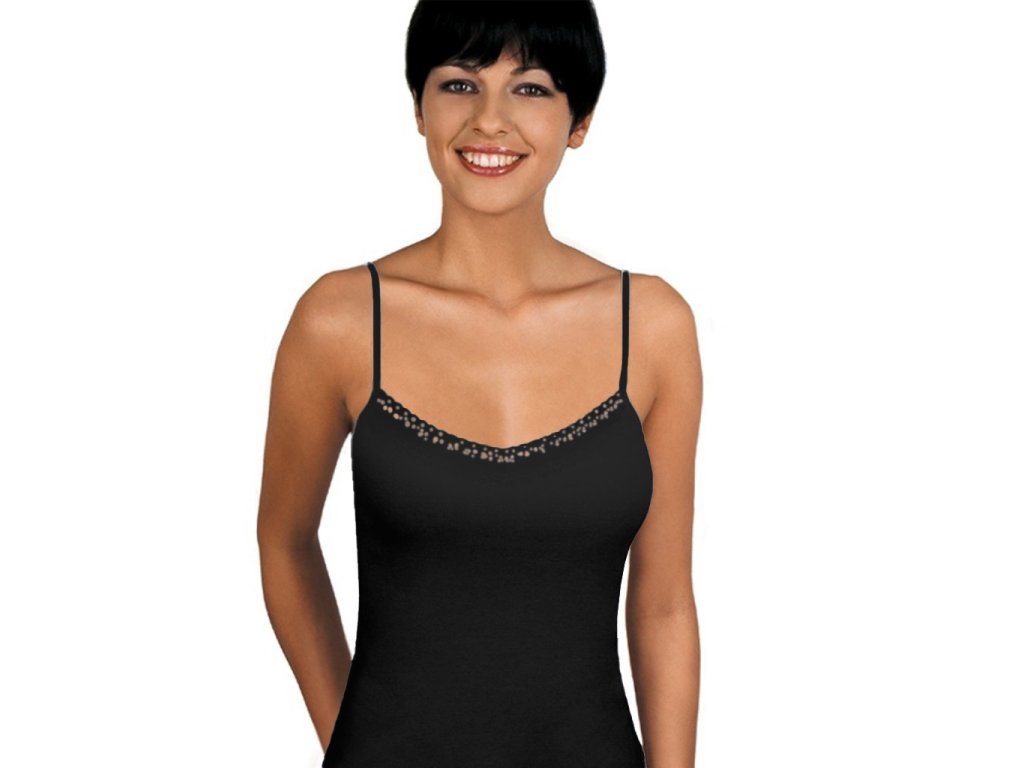 Tričko Blanca Black r.XXL ● na úzkém pásku ● z vysoce kvalitního bavlněného úpletu ● látka jemná a měkká na dotek ● velmi pohodlné nošení ● hluboký výstřih zdobený jemnou krajkou ● baleno v krabičce