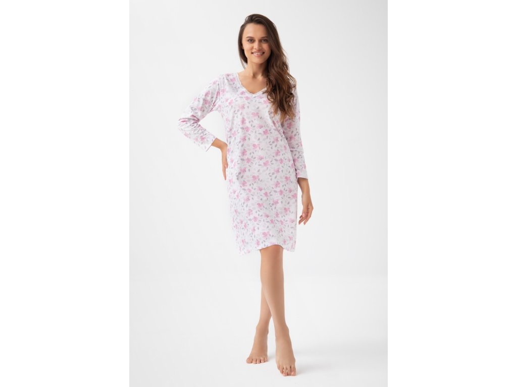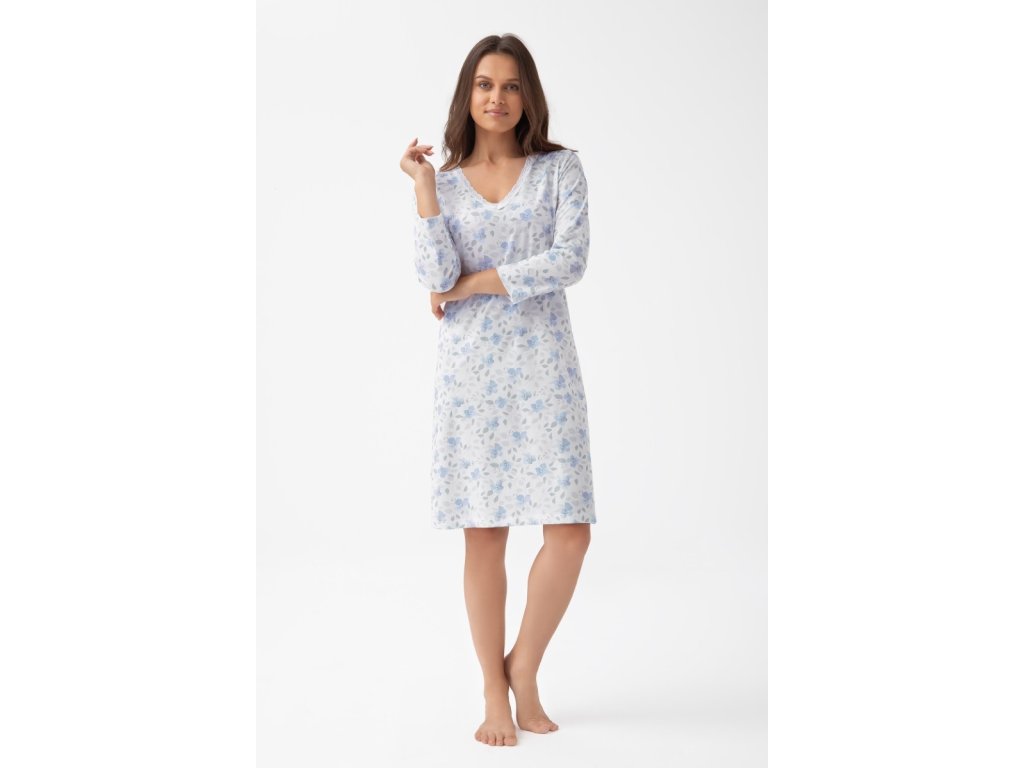 Dámská bavlněná košile s květinovým potiskem, výstřihem do V, krajkovým lemem, 7/8 rukávy a délkou ke kolenům.