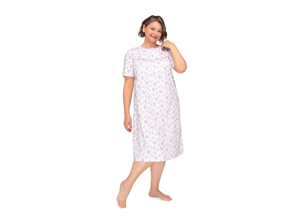 Noční košile s krátkým rukávem z měkké a pohodlné bavlny. Košile se zapíná na knoflíky a má nabíraný živůtek.