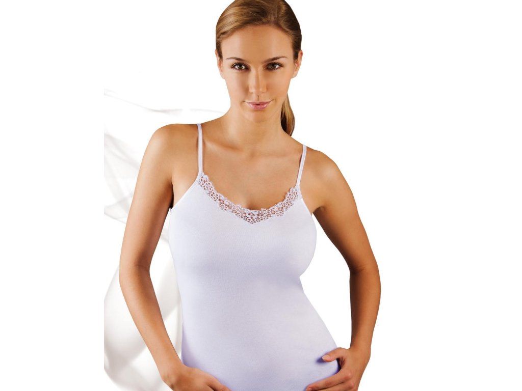 Bílé tričko Lida ● z měkké bavlny ● s úzkými ramínky ● výstřih zdobený vsadkou z jemné, krásné gipúrové krajky ● baleno v krabičce