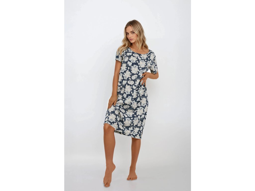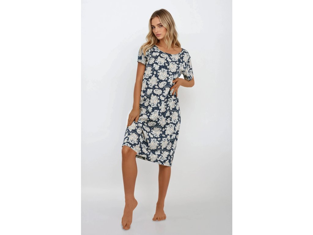 Košile Saphire Nights ● z měkké, prodyšné bavlny ● krátké rukávy a kulatý výstřih ● zaujme výrazným paisley vzorem v odstínech ecru a béžové na tmavě modrém pozadí ● ornamentální potisk dodává celkovému vzhledu elegantní, orientální nádech ● volný, klasický střih v délce ke kolenům ● ideální pro ženy, které ocení styl a pohodlí i během spánku ● ideální volba pro každé roční období