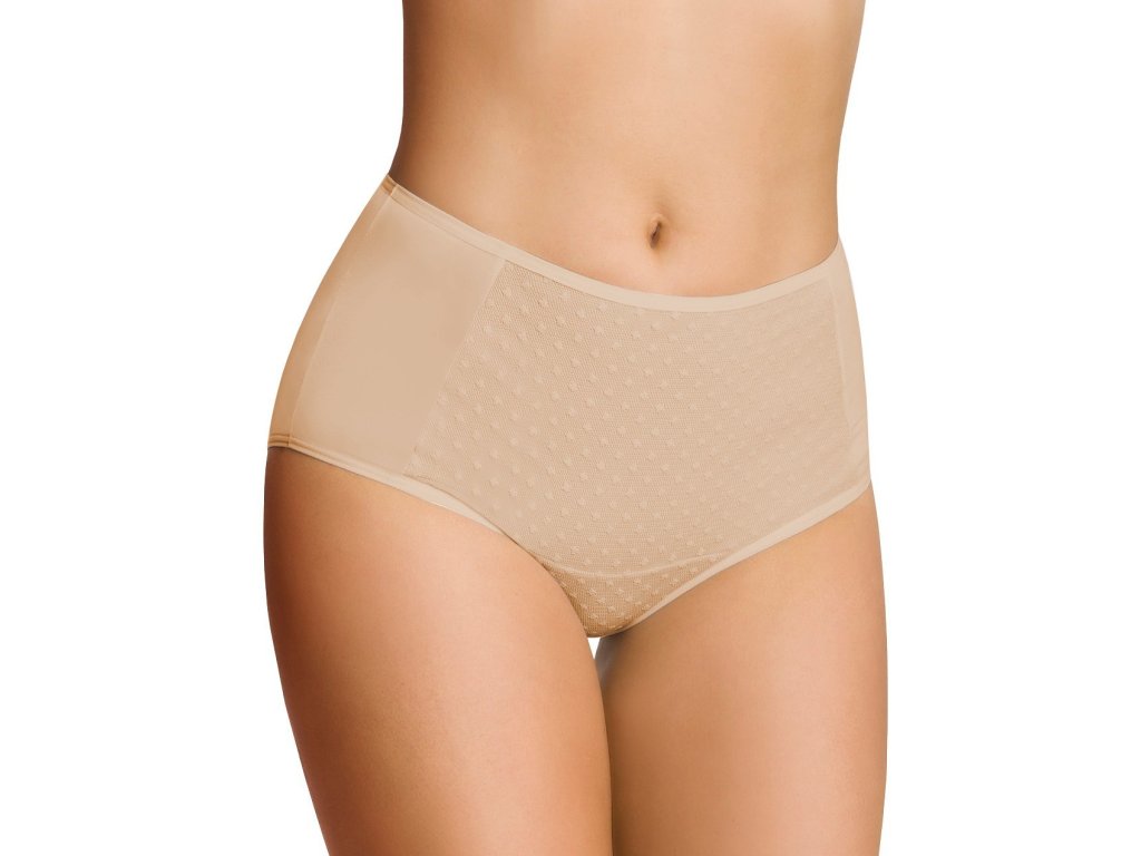Kalhotky Lilka ● z bavlny ● s vysokou linií pasu a zvýrazněnými boky ● vpředu ze vzorované tylové síťoviny s puntíky podšité bavlnou ● vzadu hladké, pevné ● v krabičce
