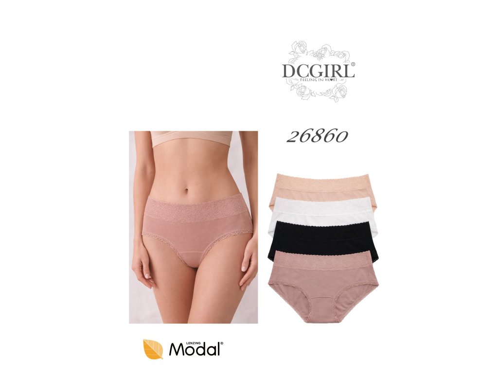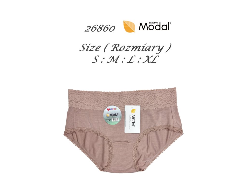 Modalové kalhotky 26860 ● klasický střih midi bikin ● vysoký pas zakrývající břicho ● široké, pohodlné boční obaly kolem boků ● nohavičky lemované tenkou elastickou krajkou ● pas zdobený širokou elastickou krajkou ● vyrobeno z modalu ● velmi měkké a příjemné na dotek ● baleno v sáčku po 2 kusech ● mix prodej, barvy vybrány náhodně