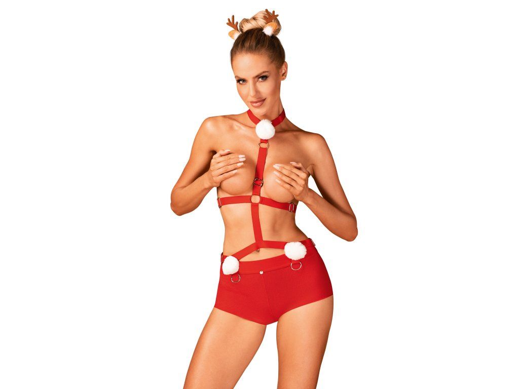 Smyslná paní Reindeer ví, jak zvýšit teplotu zimního večera! Tato sexy sada zaručuje chvíle plné rozkoše s vaším milovaným. Svůdný střih a mimořádně pikantní prvky - postroj, kalhotky a frivolní čelenka s oušky, společně vytvářejí hravý styling ve svátečním klimatu. Červený nastavitelný postroj. Kalhotky se svůdným výřezem na hýždích, zdobené bílým pozlátkem. Pohodlné zapínání za krkem zajišťuje pohodlí při nošení.
