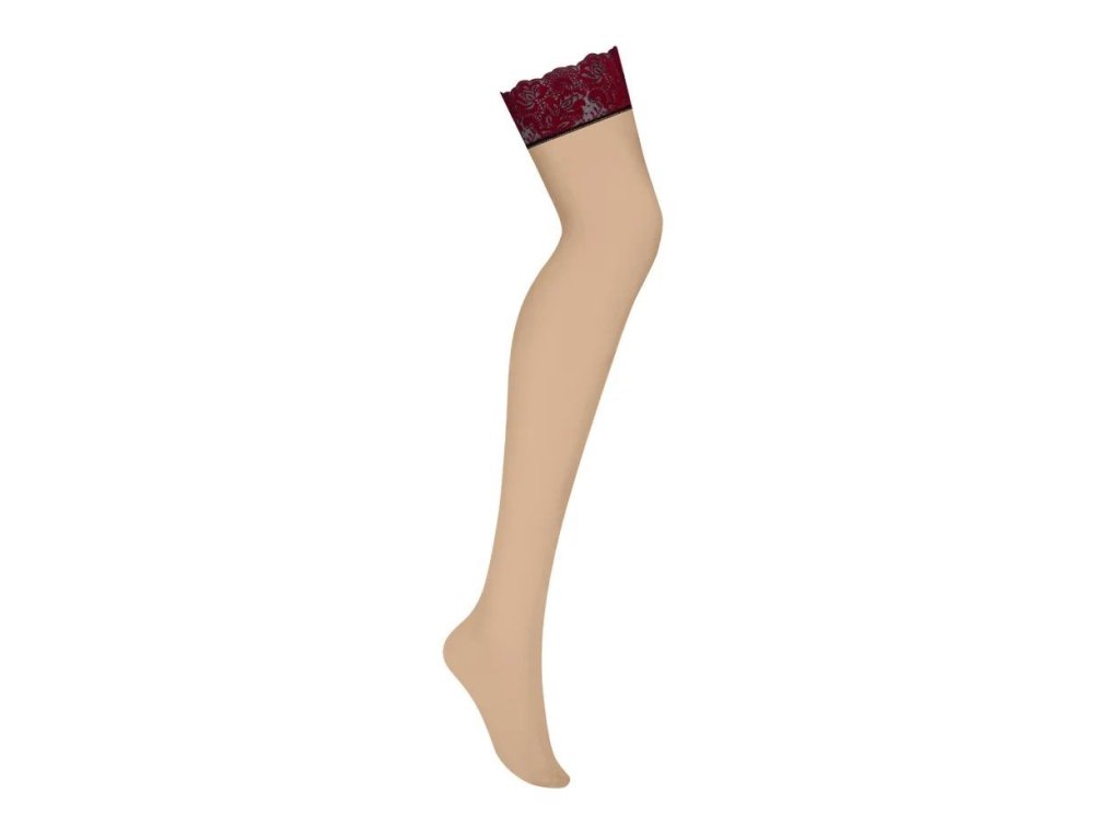 Jemné punčochy v univerzální tělové barvě - perfektně vám padnou. Smyslná vínová krajka podšitá černou látkou. Květinový, sametový vzor - dodává eleganci. Punčochy nejsou samodržící. Příjemný materiál na dotek.