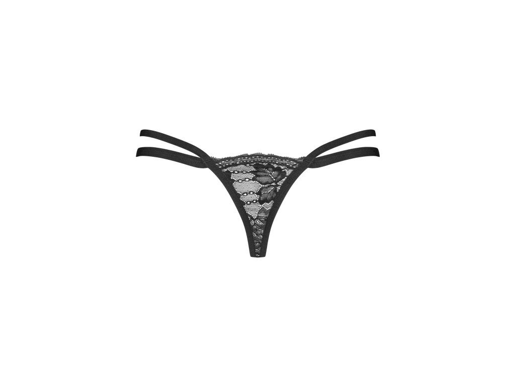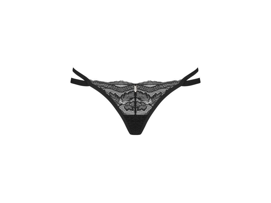 Nutris tanga ● černá s krajkou s květinovým vzorem ● netradiční střih ● dvojité lemování na bocích ● oválný štítek s nápisem Obsessive ● bez niklu