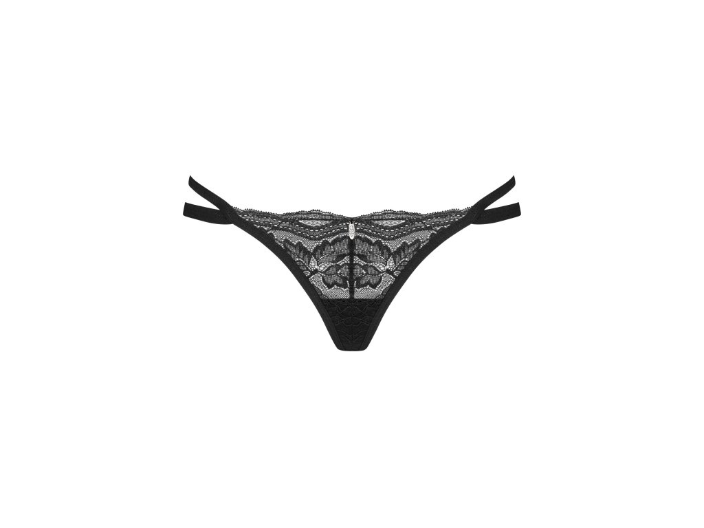 Nutris tanga ● černá s krajkou s květinovým vzorem ● netradiční střih ● dvojité lemování na bocích ● oválný štítek s nápisem Obsessive ● bez niklu