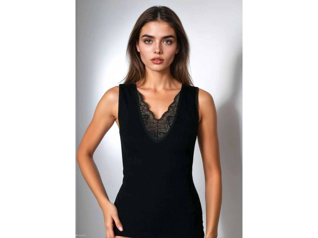 Černá halenka Ovena ● střih bez rukávů ● klasický top s širokými ramínky ● vyrobeno z viskózy ● hluboký výstřih do V s květinovou krajkou ● záda zdobená širokou krajkovou vsadkou ● vysoce kvalitní přírodní, vzdušná viskóza ● přiléhavý střih ● perfektní, elegantní základ pod bundu nebo svetr