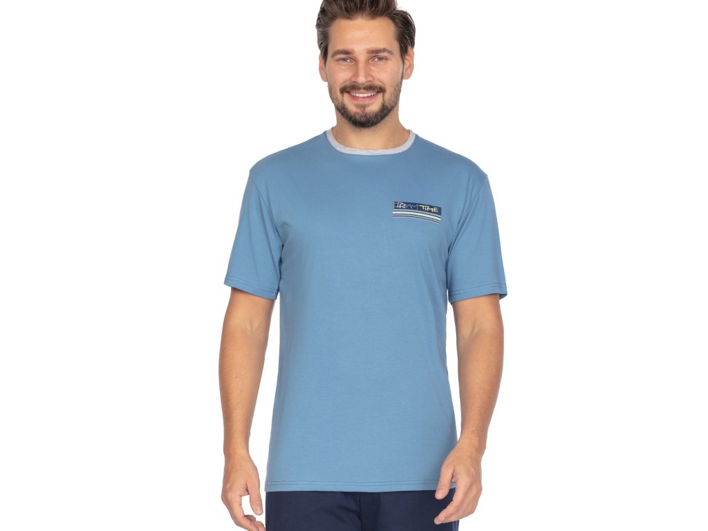 Pánské pyžamo 460 ● vyrobeno z vysoce kvalitní bavlny ● tričko s krátkým rukávem ● kulatý výstřih zdobený kontrastním lemováním ● přední strana zdobená malým potiskem ● doplněno krátkými hladkými šortkami