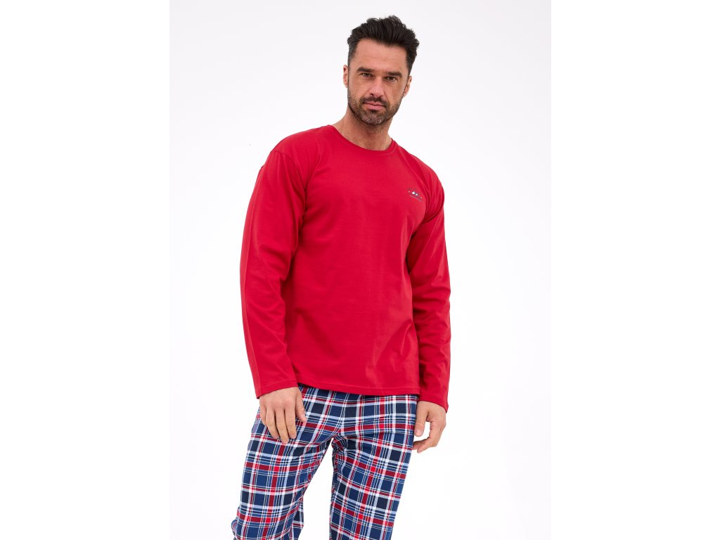 Pánské pyžamo 124/312 Ready 3 ● s dlouhými rukávy a dlouhými nohavicemi ● ze 100% přírodní, prodyšné bavlny ● tričko ve vínovém odstínu ● zdobené jemným potiskem na hrudi ● klasické, klasický kulatý výstřih ● dlouhé kalhoty v námořnicky modrém kostkovaném vzoru s červenými akcenty ● volný střih pro naprosté pohodlí a komfort při spánku ● látka je měkká na dotek a jemná k pokožce ● baleno v elegantní krabičce ● vhodné také jako praktický dárek v intenzivním červeném odstínu s jednoduchým střihem.