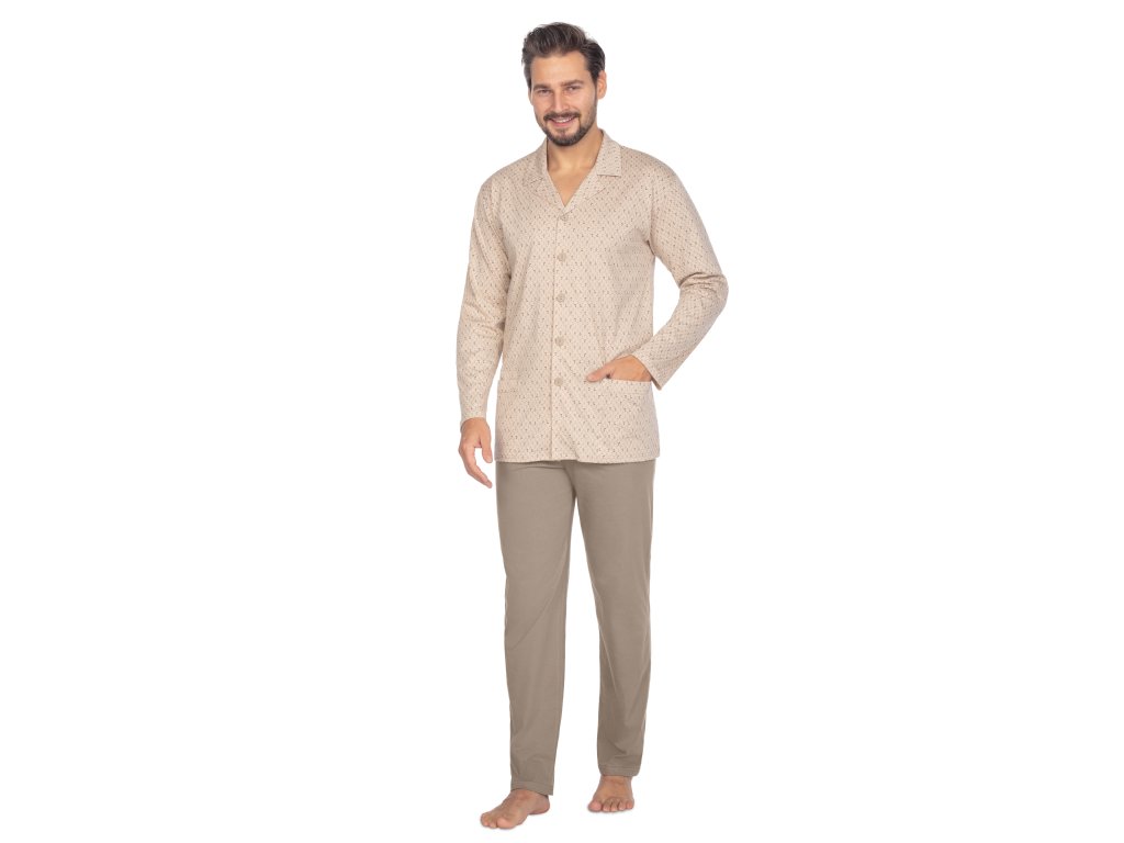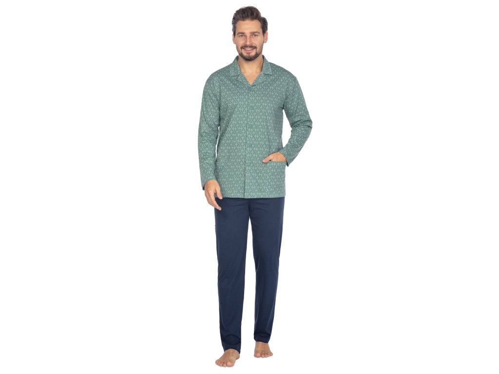Pánské pyžamo 463A ● komplet s tričkem na zip ● dlouhý rukáv ● vzorovaná halenka s límečkem, zapínání na knoflíky ● má boční kapsy ● vrchní díl potištěný jemným geometrickým vzorem ● klasické dlouhé jednotné kalhoty ● vyrobeno z kvalitní měkké bavlny ● poskytuje pohodlí při spánku
