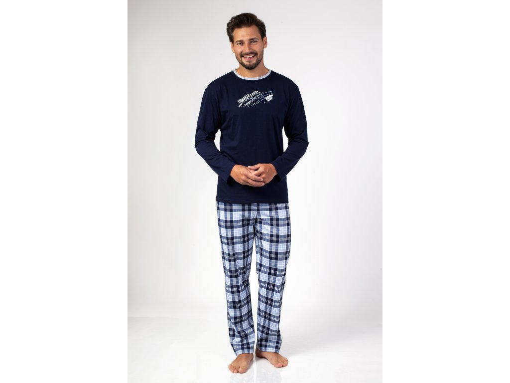 Pánské pyžamo 469A ● z přírodní bavlny ● s dlouhými rukávy a dlouhými nohavicemi ● s kulatým výstřihem zakončeným elegantním záhybem ● s hladkým vrškem s ozdobným potiskem ● kalhoty s klasickým kostkovaným vzorem volného střihu ● pletenina je měkká na dotek a jemná k pokožce